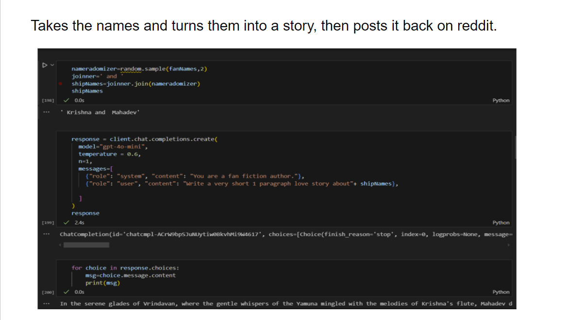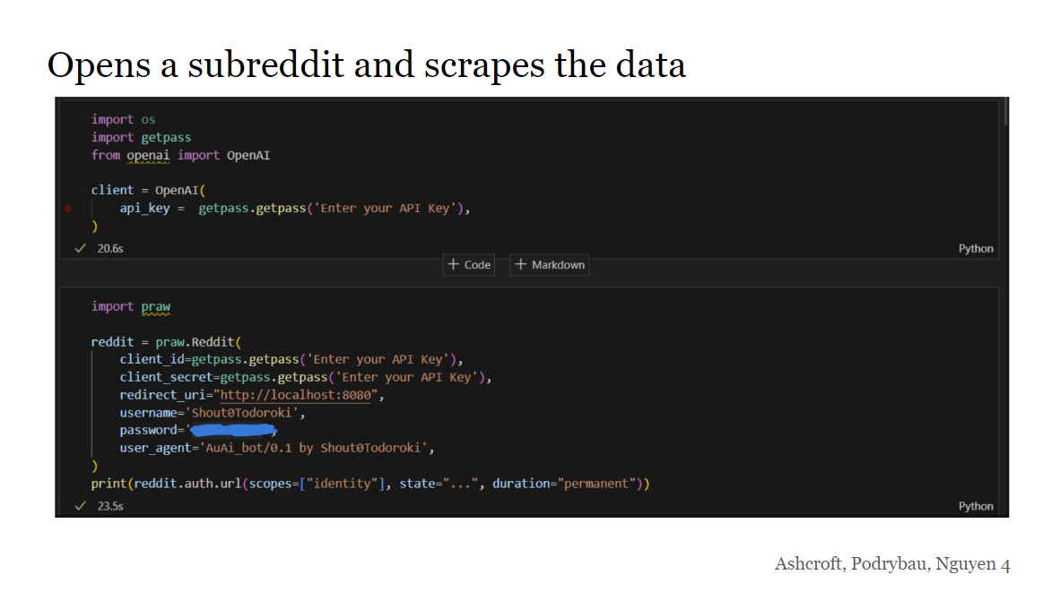 We made use of OpenAi in integration with our code, and reddit. Did you know you have to use old reddit to create a bot? Now you do!