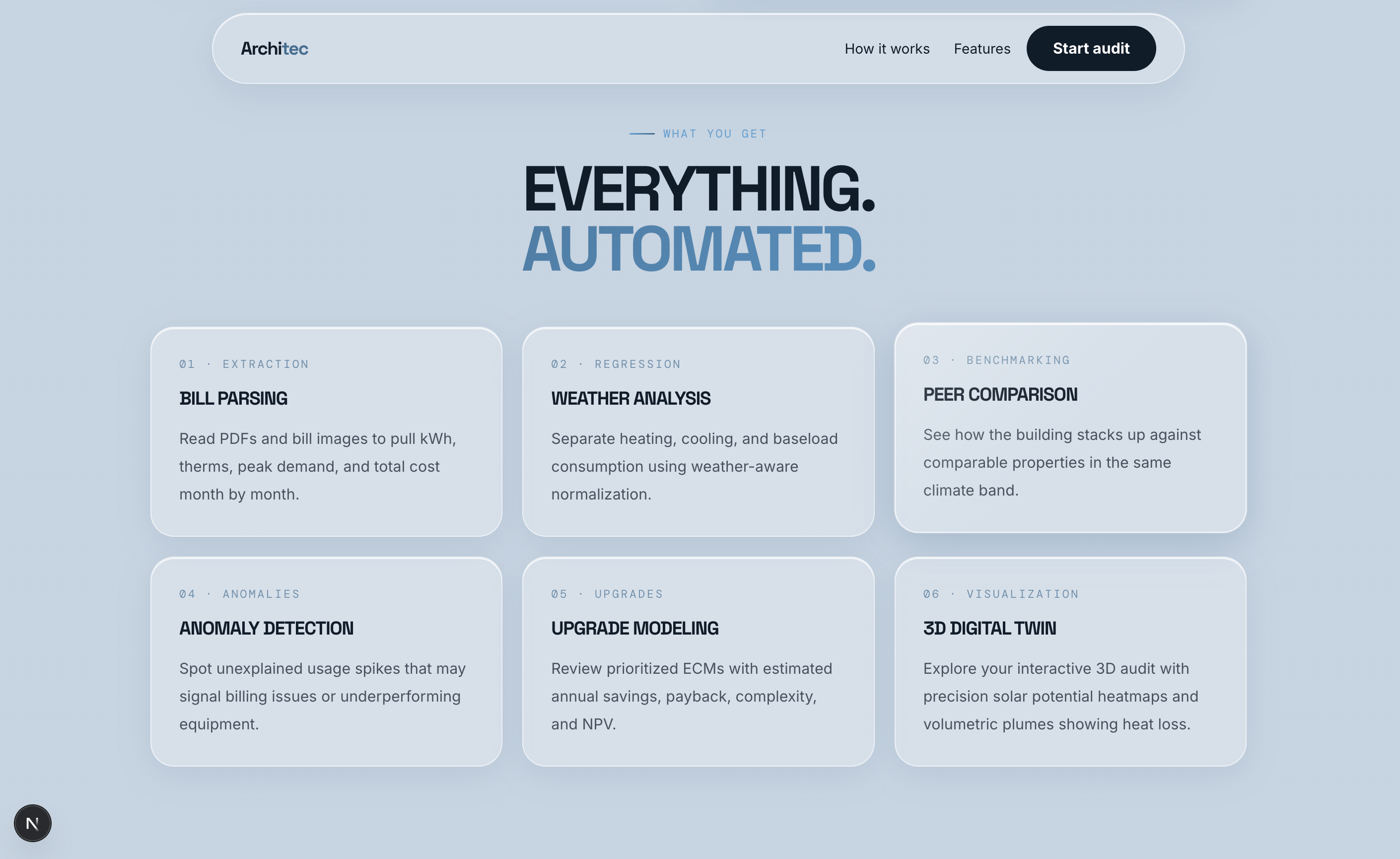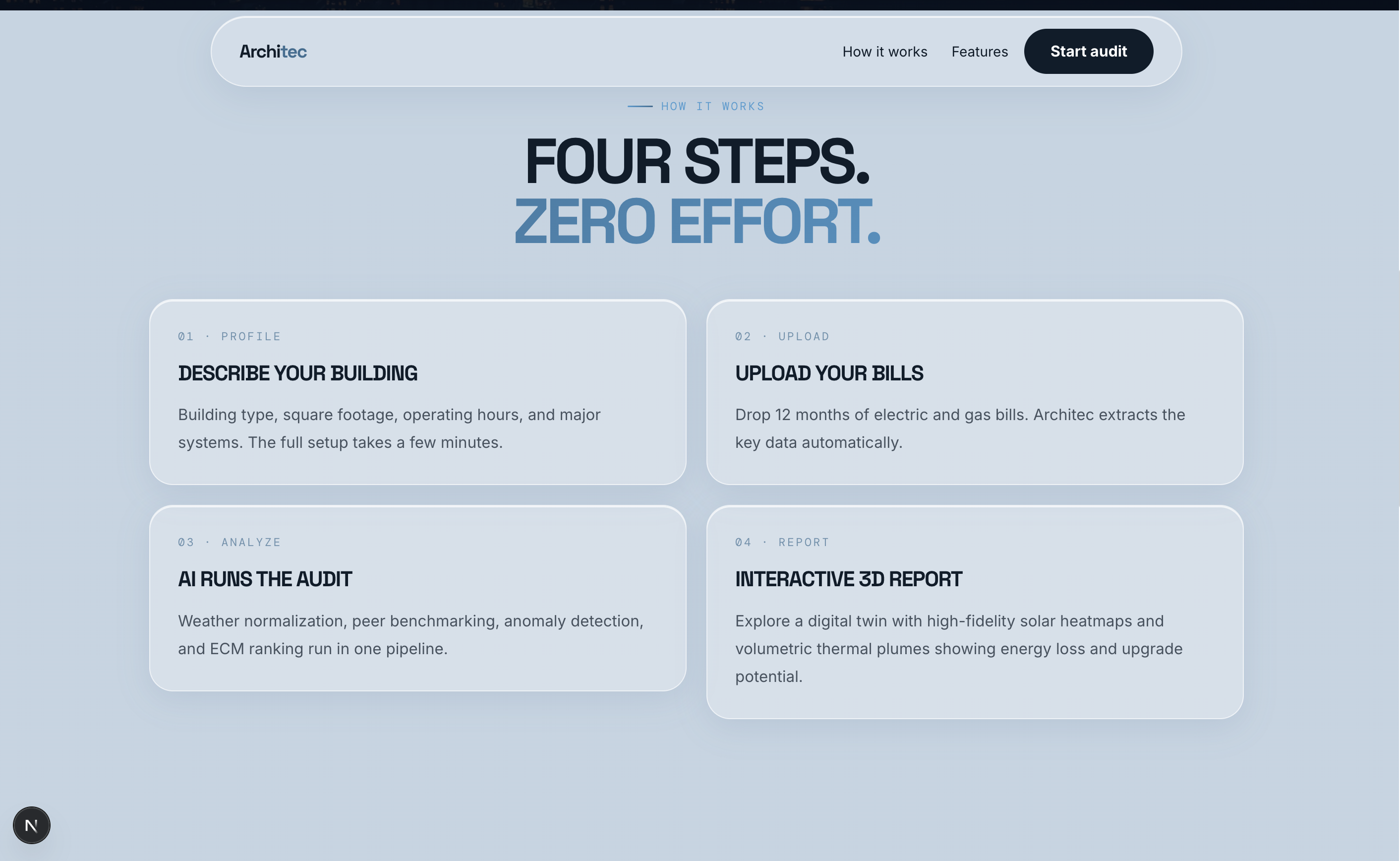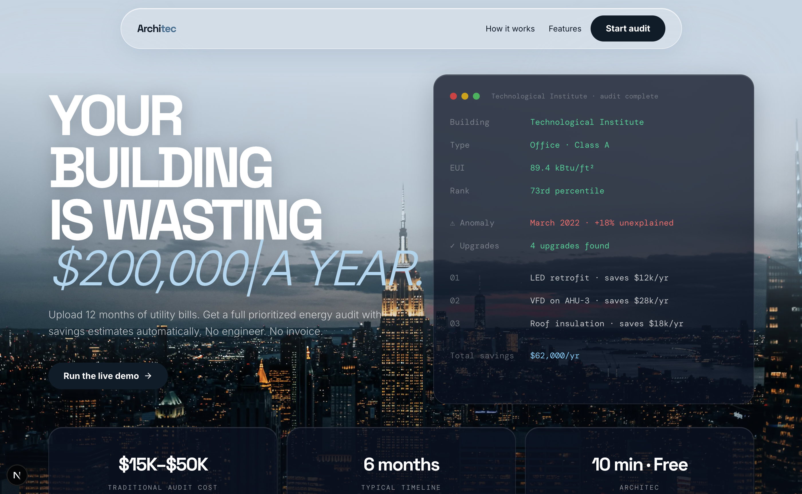 Architec gives any building owner a professional energy audit in under 10 minutes, for free. You upload 12 months of utility bills, answer a few quick questions about your building, and the platform does the rest. It reads your bills automatically, pulls in local weather records, and figures out exactly how much of your energy bill comes from heating, how much from cooling, and how much is just always-on equipment running in the background. It then compares your building against thousands of similar buildings nationwide to show you where you rank and where you're overpaying. If your energy use ever spiked in a way the weather can't explain, the system catches that too and flags it as a finding. From all of that, an AI energy engineer writes you a full audit report with specific recommended upgrades, estimated costs, and exactly how long each one takes to pay for itself. You can also ask it questions out loud and get answers in plain English through a voice interface. And instead of reading a dry PDF, you see your building in 3D with heat loss and solar potential mapped directly onto it, so the story of where your energy is going is something you can actually see.