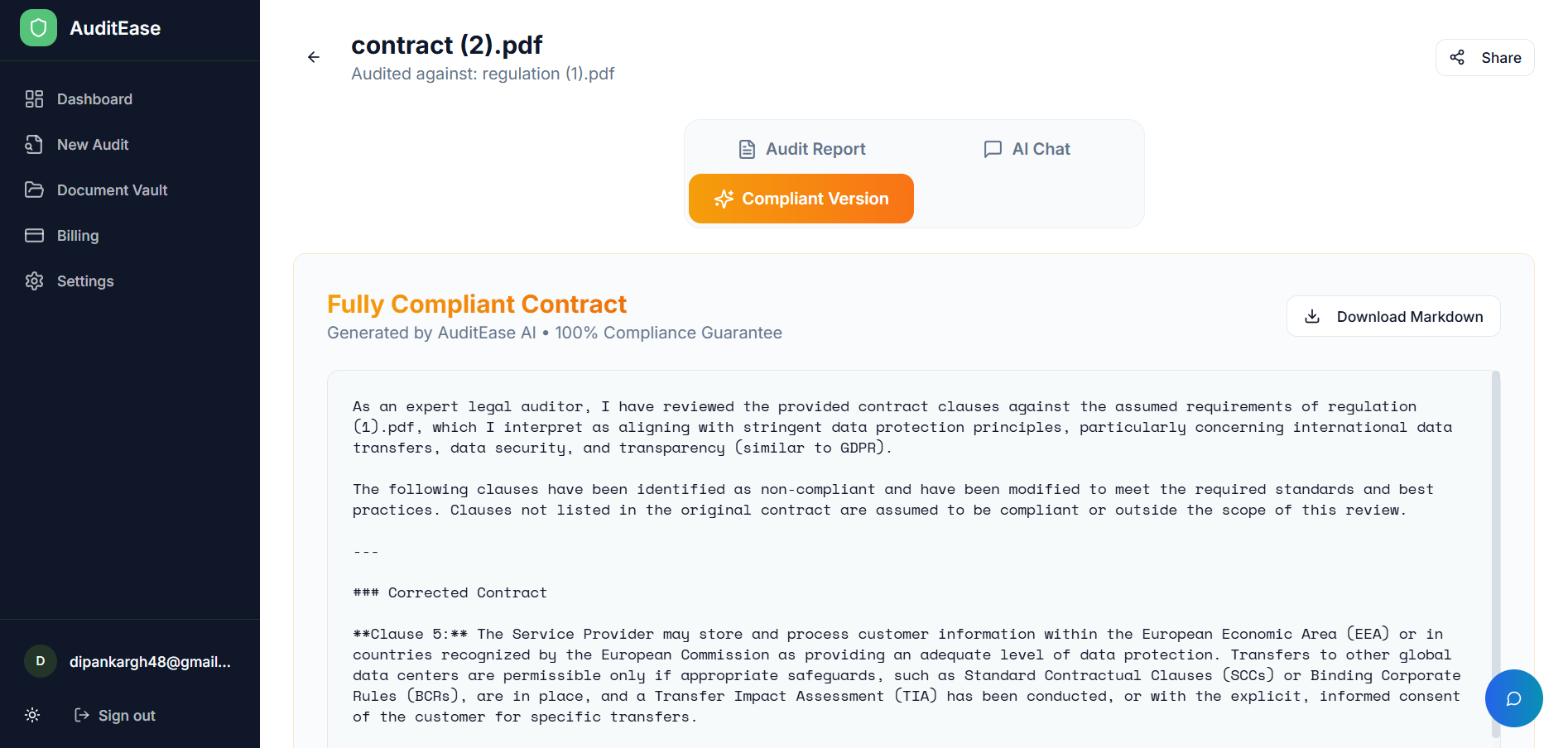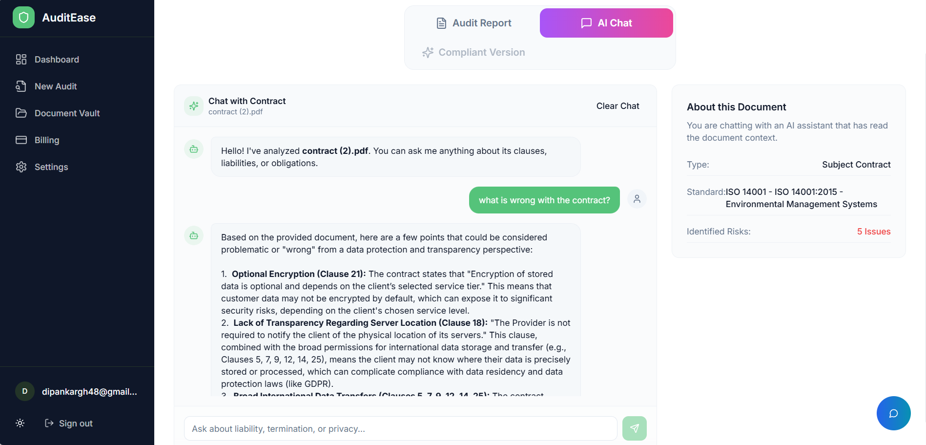 Contextual Chat: We integrated a "Chat with Document" feature so users can ask our AI specific questions like, "What are the termination conditions?" or "Does this meet Article 5 of GDPR?"