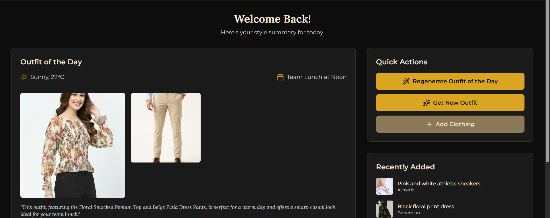 Designing meaningful outfit logic instead of random clothing combinations. Structuring wardrobe data properly in SQLite for fast retrieval. Ensuring AI suggestions match real-world fashion sense. Connecting AI output cleanly with frontend components. Planning for scalability while initially using a lightweight database.