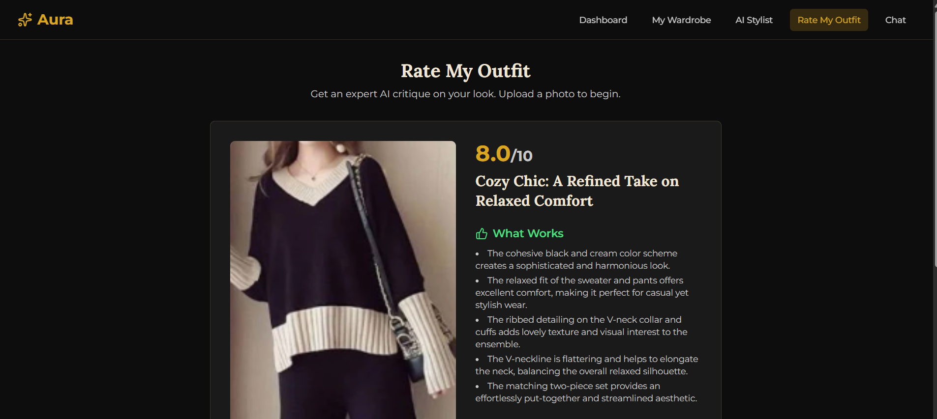 Choosing outfits daily is surprisingly time-consuming, especially when people already own good clothes but don’t know how to combine them well. Most fashion apps either promote shopping or give generic suggestions without considering a user’s actual wardrobe, occasion, or theme. AURA was inspired by the idea of turning a personal wardrobe into a smart, AI-powered stylist that helps users dress better with what they already have, while also suggesting matching products when needed.