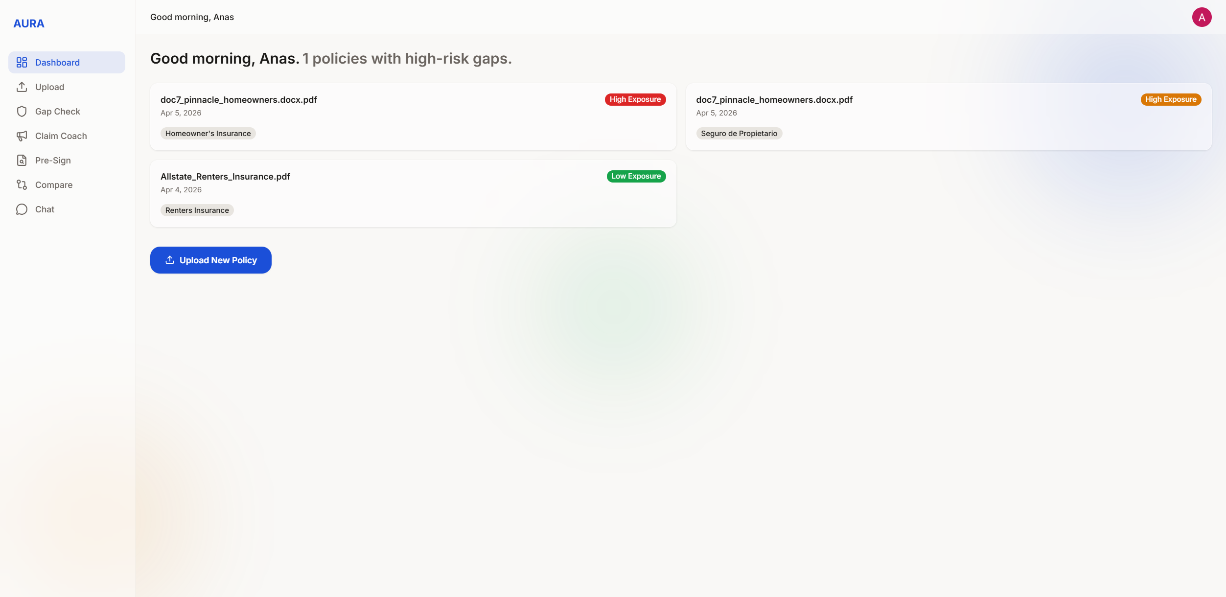 Aura is an AI-powered insurance advisor that works in 10 languages with voice. Users upload any insurance policy — renters, auto, home, commercial — and Aura:
