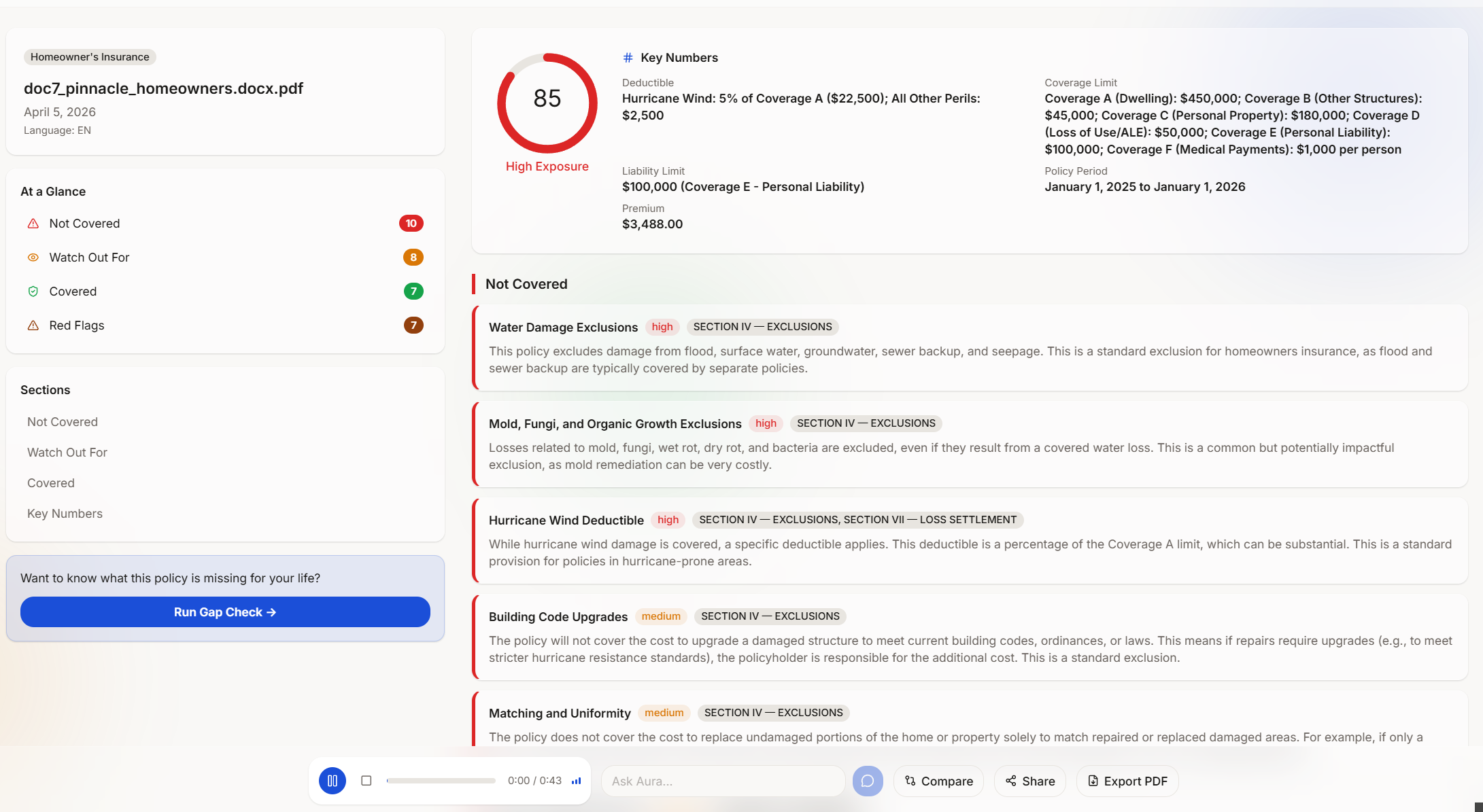 - Advises before you sign — upload a policy you're considering and Aura benchmarks it against market standards using grounded search