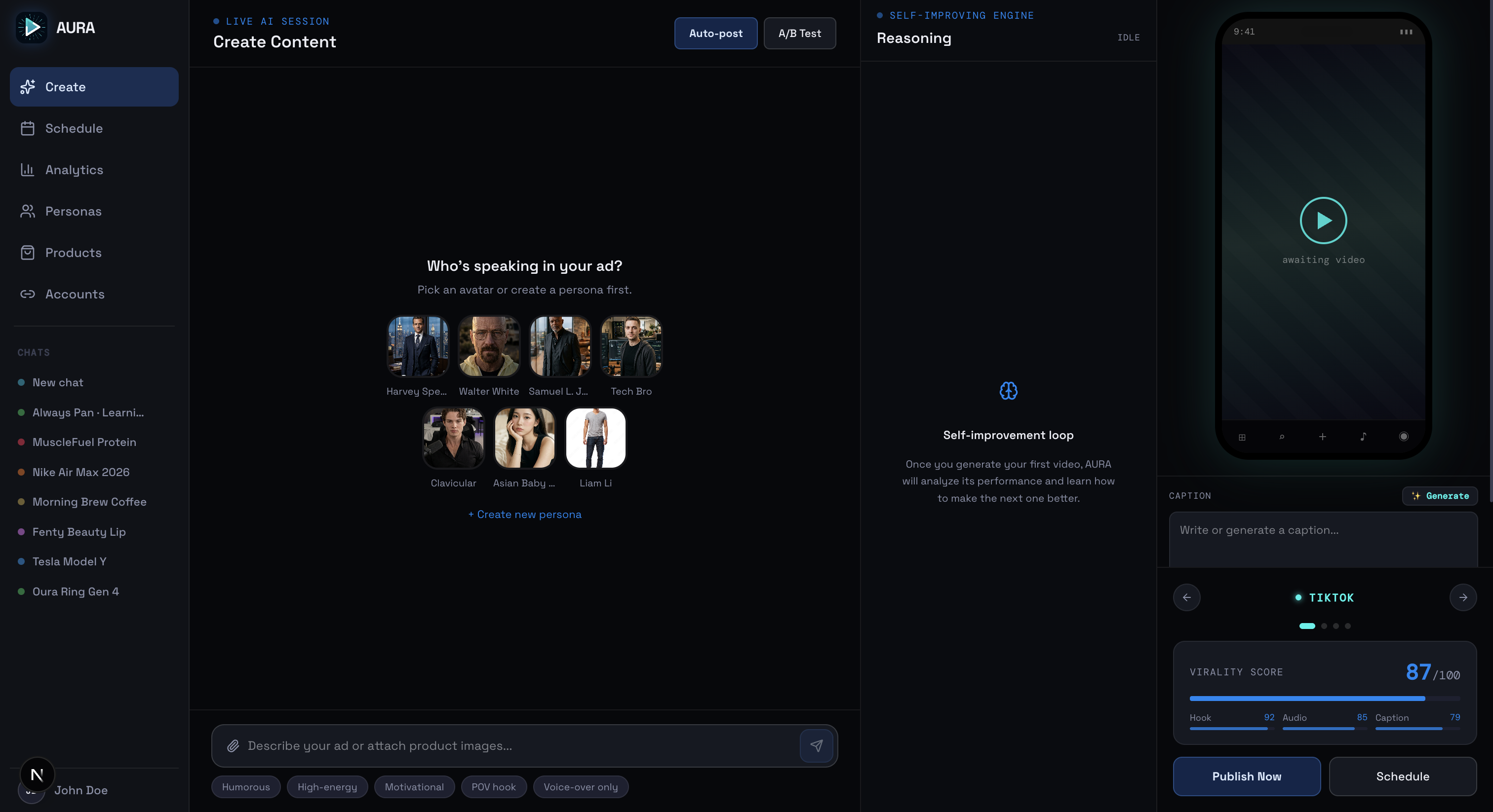 We’re proud that Aura is more than a set of disconnected demos. It already brings together personas, content generation, scheduling, analytics, and a live autonomous agent workflow into one cohesive product. We’re especially proud of the agent layer, because Aura does not stop at generating a single clip. It can research competitor content, extract the angle, adapt it to a persistent persona, generate multiple short scenes, stitch them into a finished ad, and move that output toward a publishable draft with a consistent AI-generated voice.