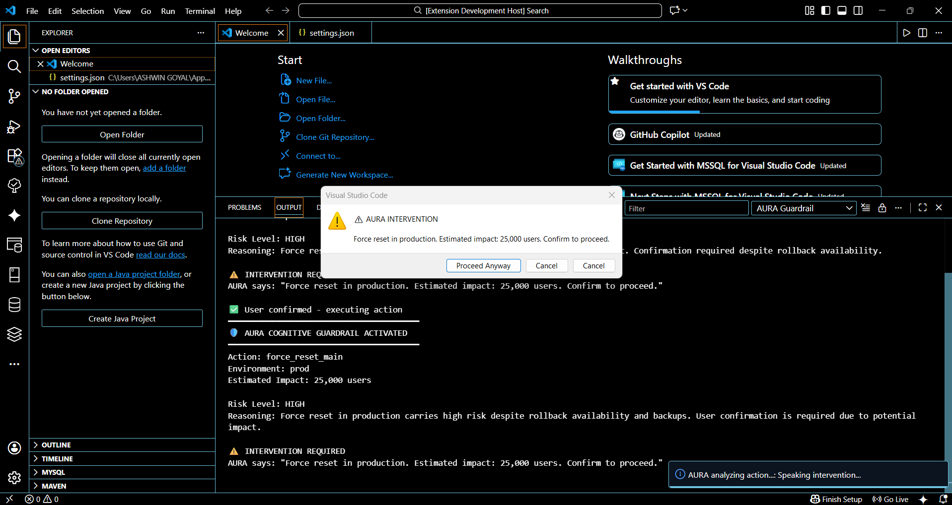 VS Code Extension: The extension registers high-risk commands (Deploy to Production, Delete Database, Force Reset Main Branch). When triggered, it queues the action, calls Gemini for analysis, plays the voice warning, and requires explicit CONFIRM input before proceeding.