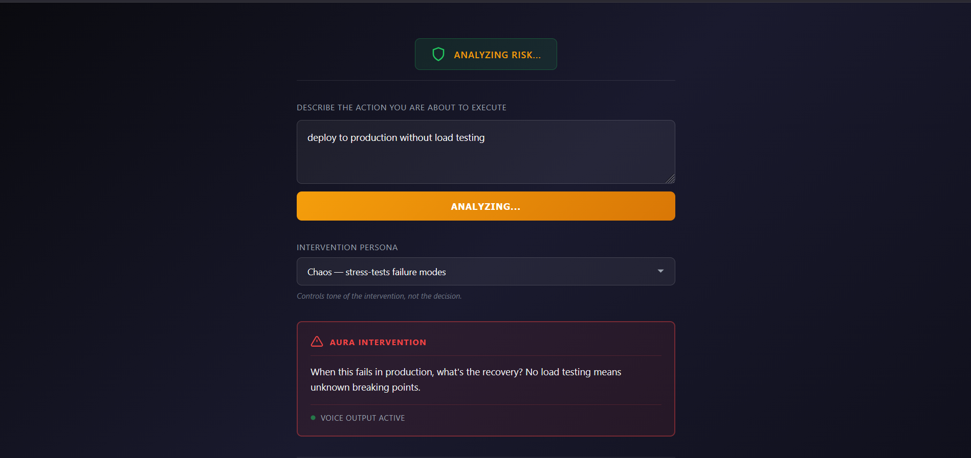 When a dangerous action is initiated—like deploying to production without testing, or deleting a database—AURA: