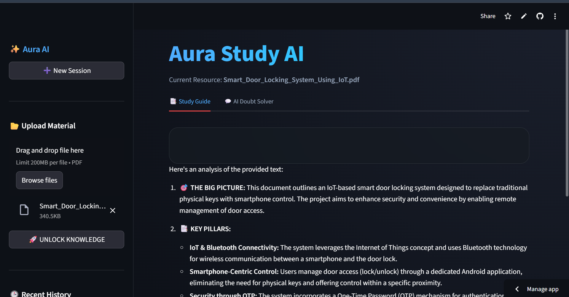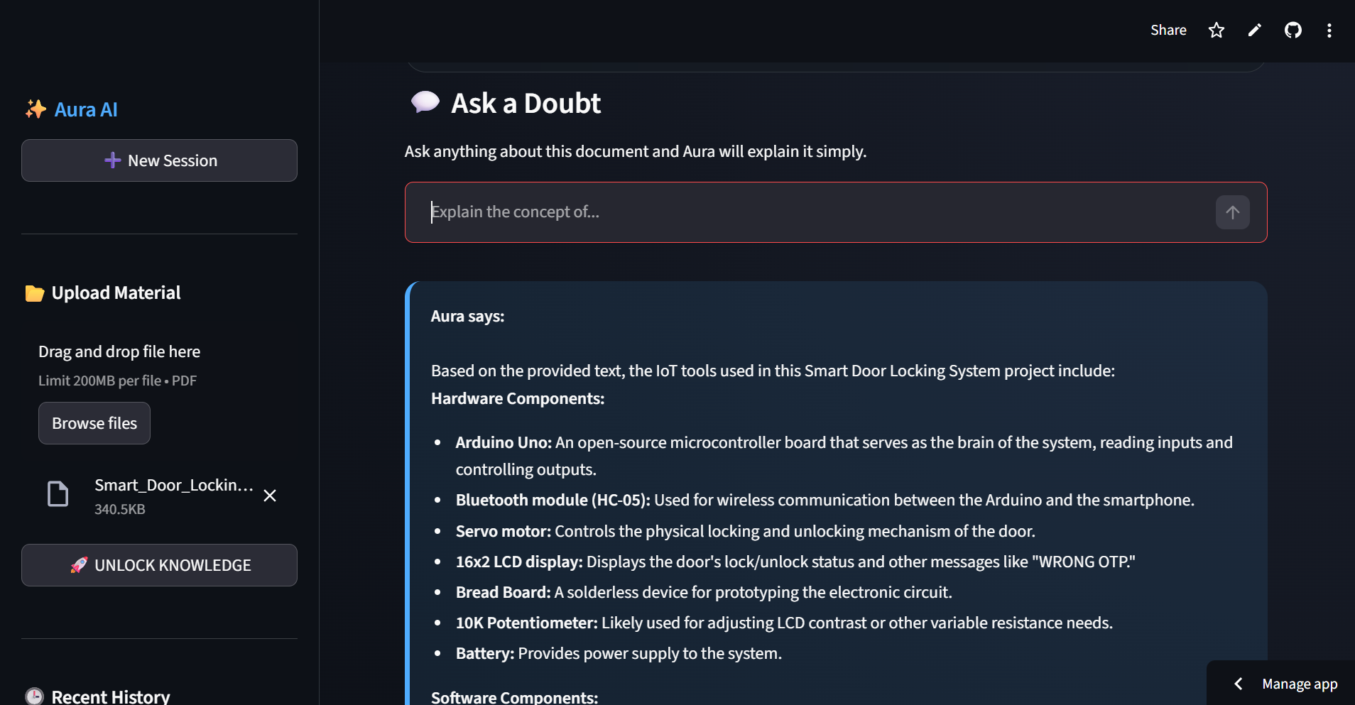 Doubt Solving Users can ask questions related to the uploaded study material, and the Nova model generates contextual answers using the information from the document.