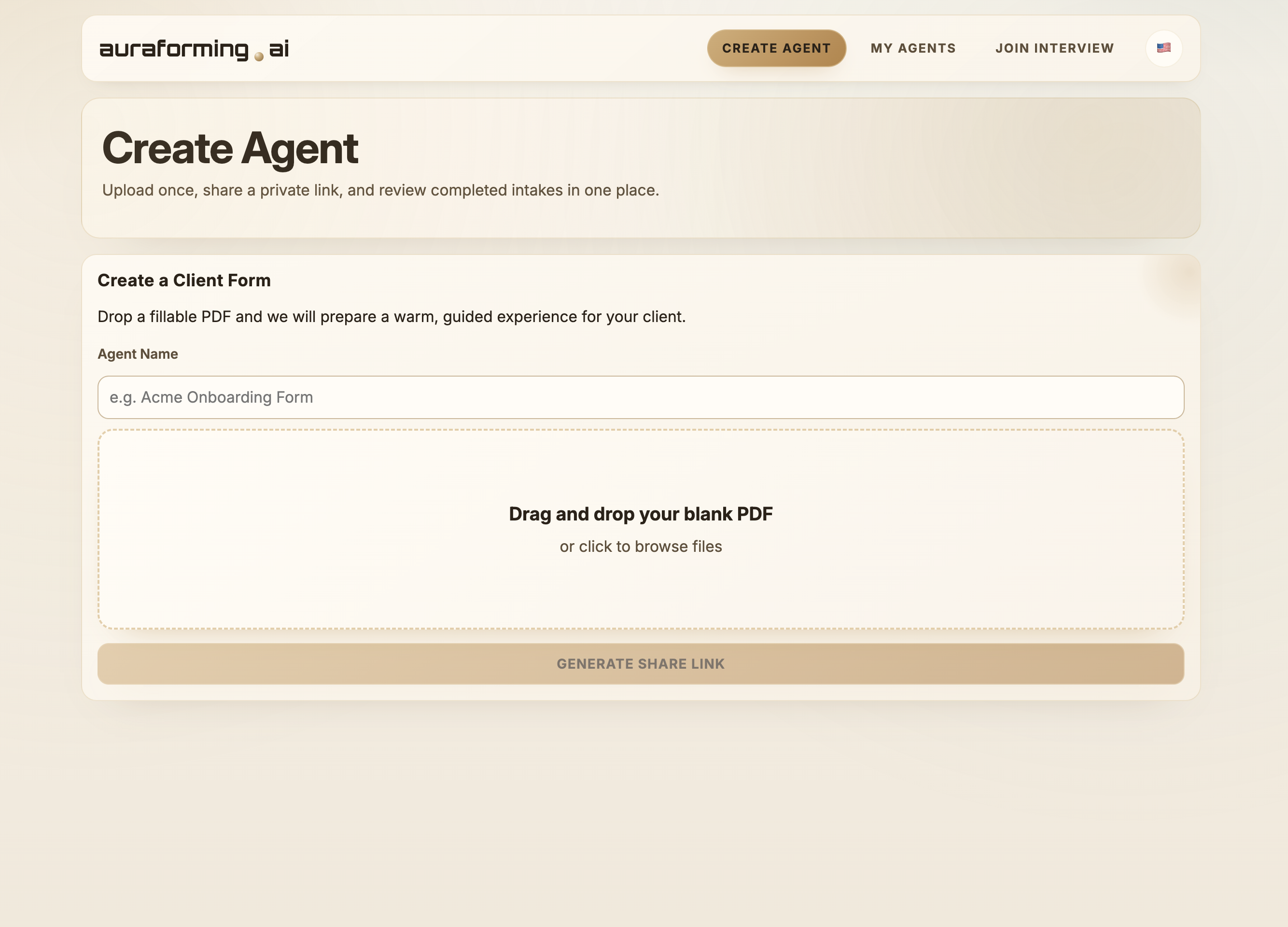 auraforming.ai lets a business upload any blank fillable PDF. We auto-create a custom AI “agent” for that specific form and generate a shareable link.