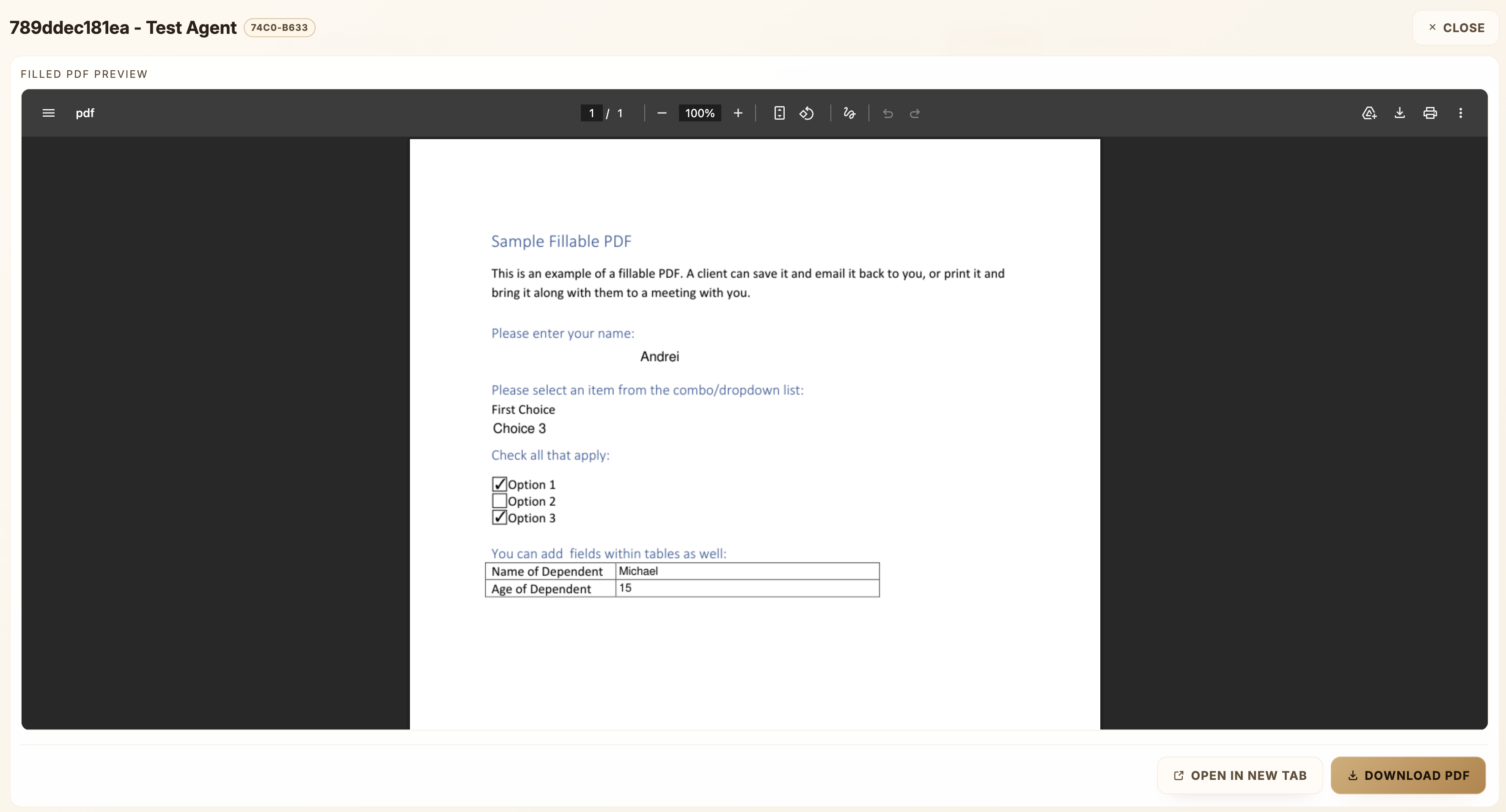 Clients open the link and fill out the form by talking to the AI. They can ask for clarification on weird terms whenever they need it, and at the end, they get a cleanly filled-out PDF.