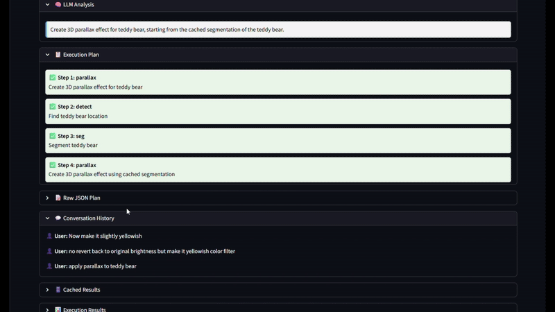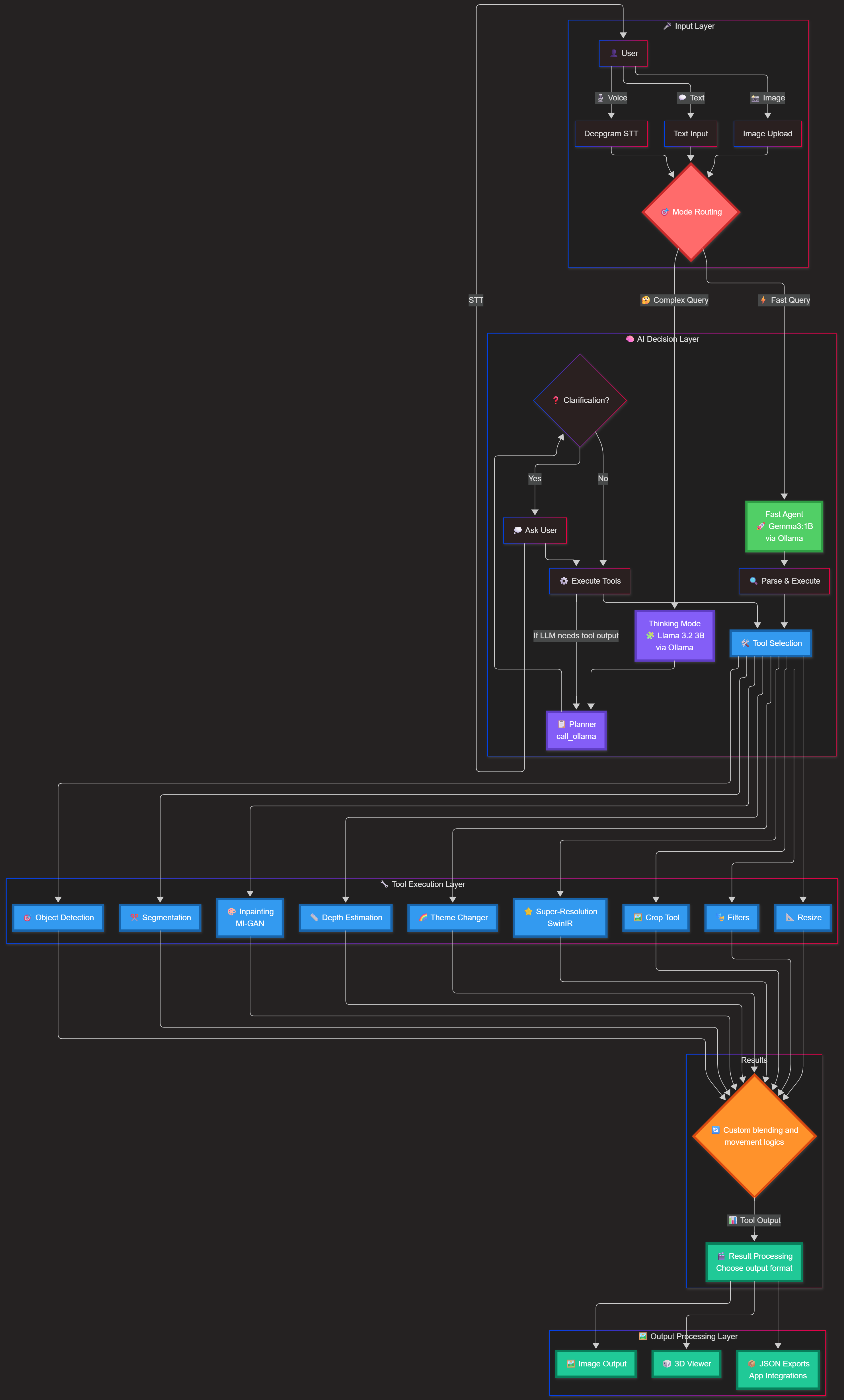 Built with FastAPI + Python for the AI pipeline, React & React Native for UI, Ollama for on-device LLMs (Gemma3 1B, Llama3.2 3B), Deepgram for voice, and optimized vision models (BiRefNet, DepthAnythingV2, MobileSAM, MI-GAN, SwinIR). Includes a custom multi-step orchestrator.