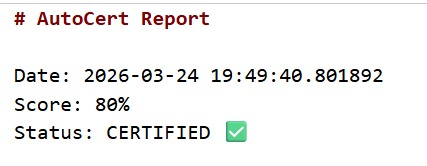 $$\text{Trigger} \rightarrow \text{AutoCert Agent} \rightarrow \text{SKILL.md Checklist} \rightarrow \text{Score}$$