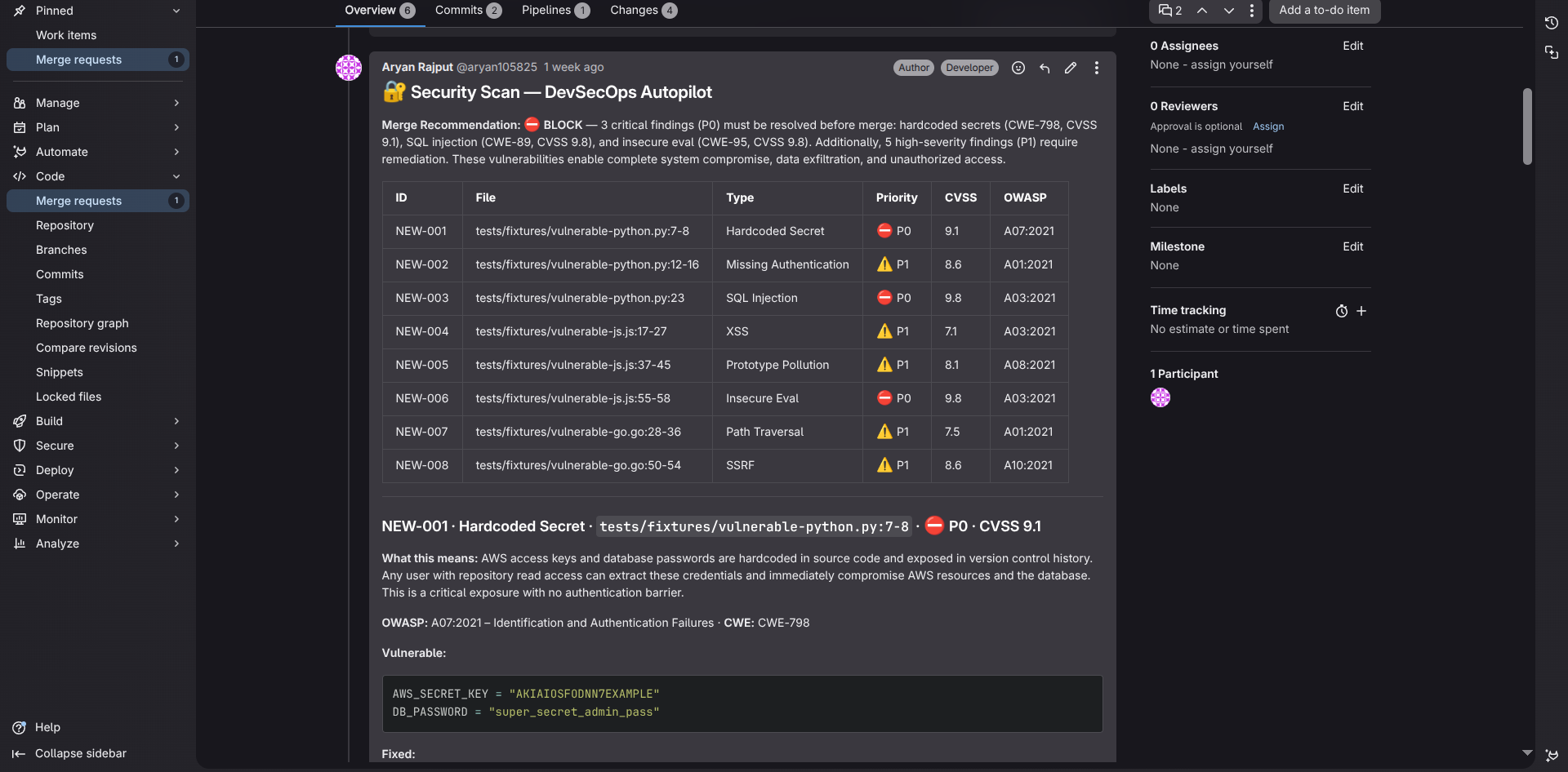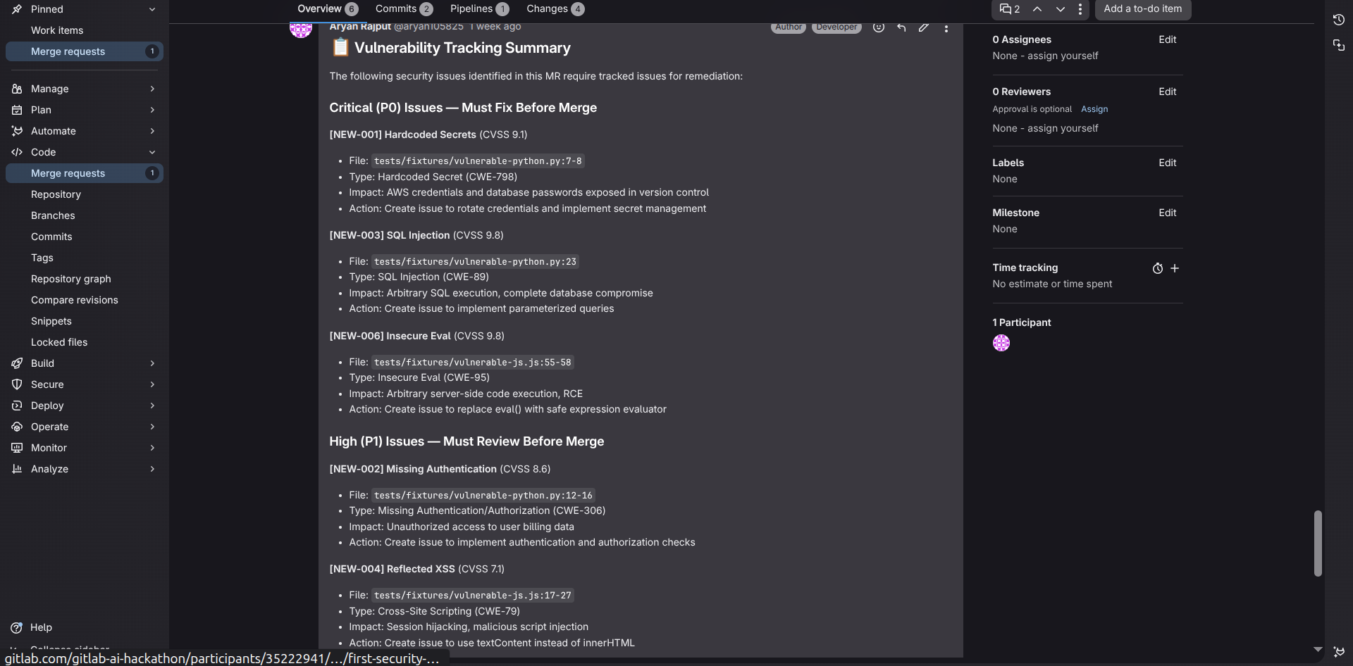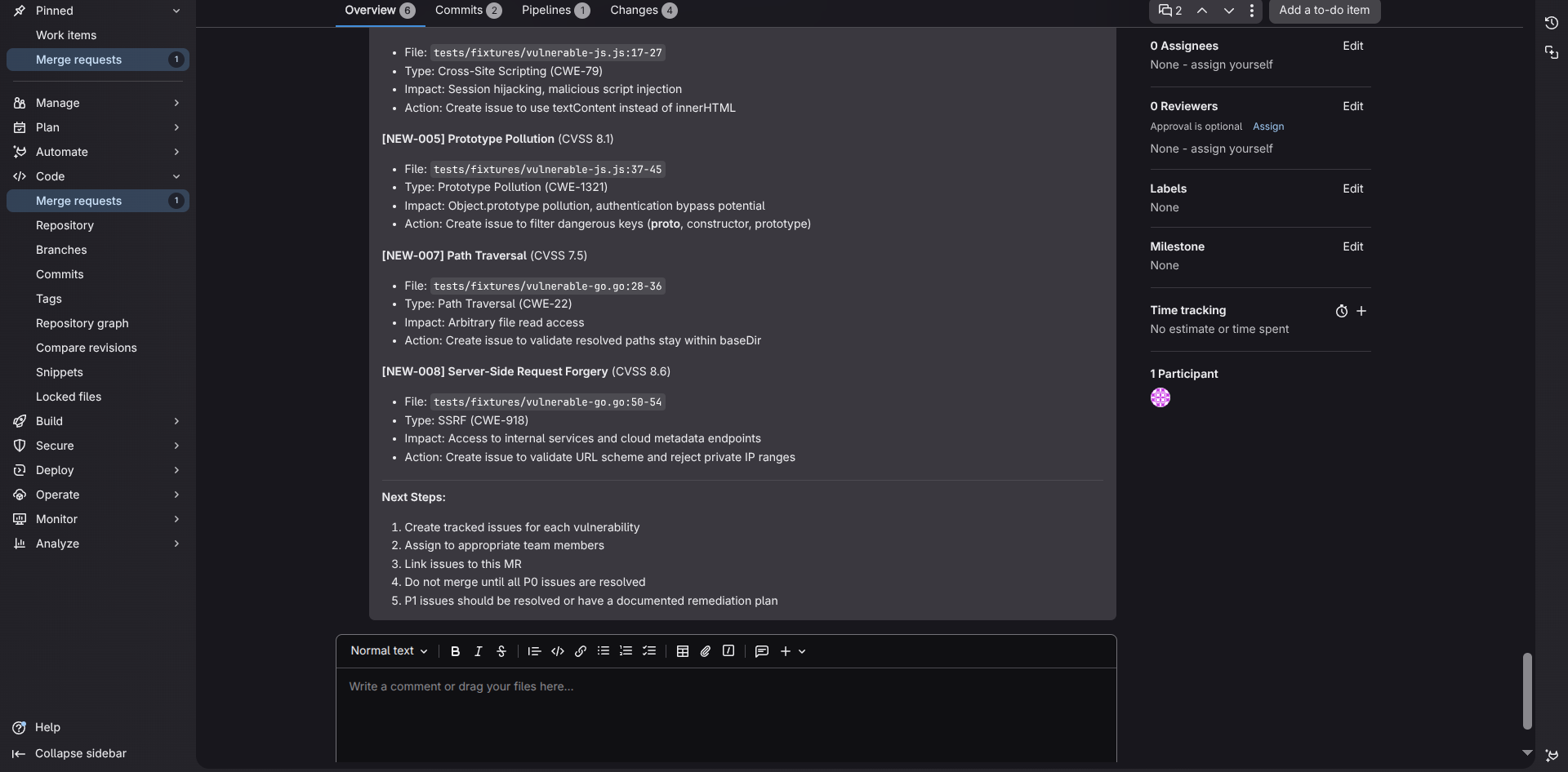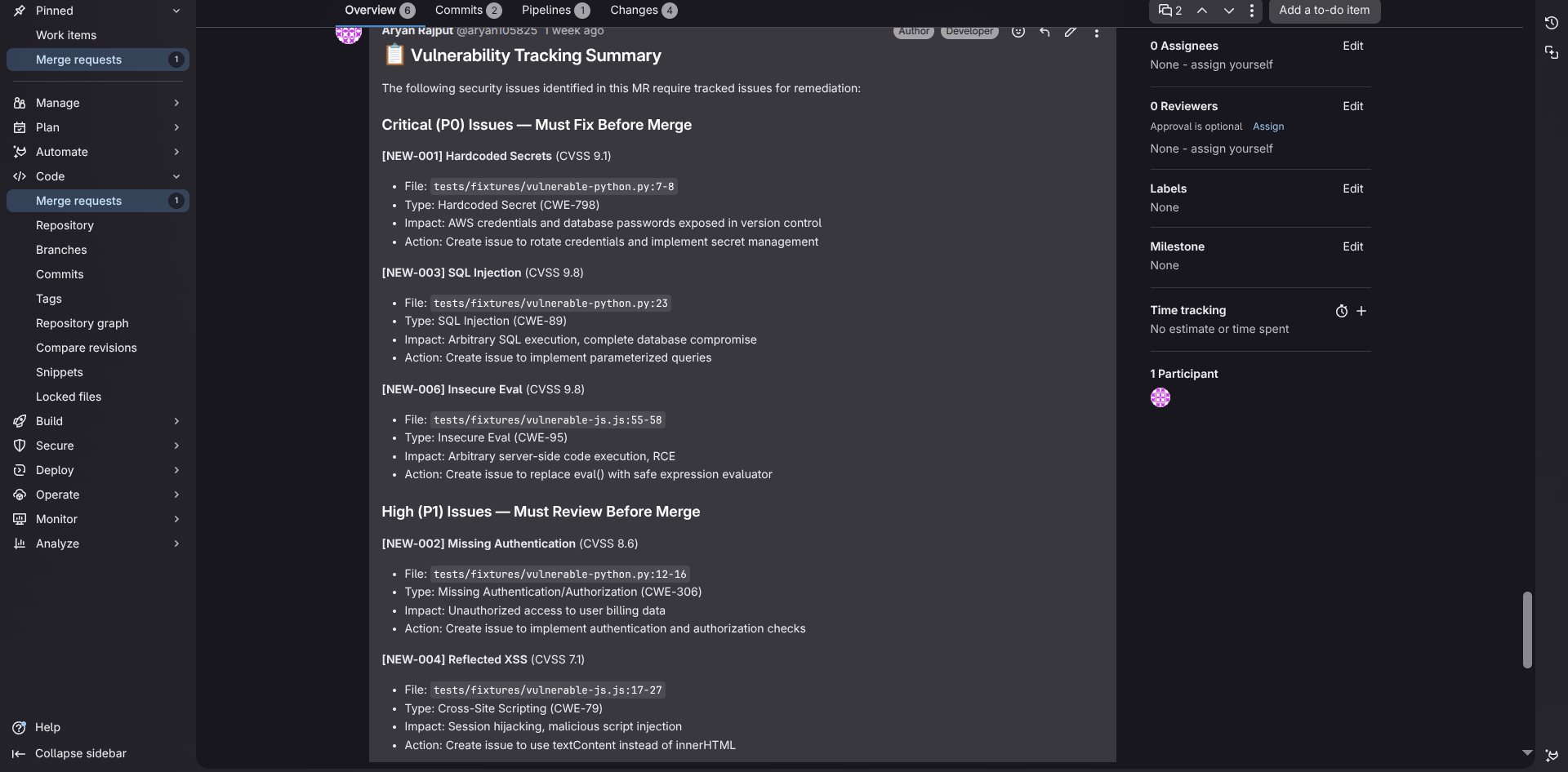 It autonomously reads the code diff, scans for 12 specific vulnerability classes (including SQLi, XSS, SSRF, and Prototype Pollution), and maps every finding to OWASP, CWE, and CVSS 3.1 frameworks. Finally, it posts a structured Markdown code review directly inside GitLab, complete with actionable fix snippets, and natively creates tracked vulnerability issues for critical findings.