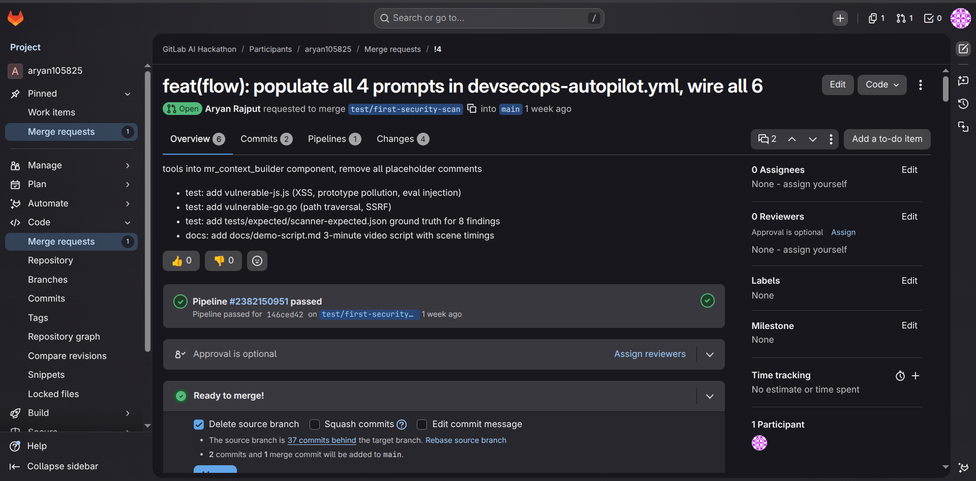 Security vulnerabilities that slip through code review carry an average breach cost of $4.45M. Meanwhile, developers spend up to 30% of their time on non-feature work dealing with SAST tools that flag issues but do not actually fix them. Security is arguably the number one bottleneck in enterprise CI/CD. We realized that AI shouldn't just answer questions; it should act as a tireless security engineer on every Merge Request—with zero infrastructure, zero setup, and zero context-switching.
