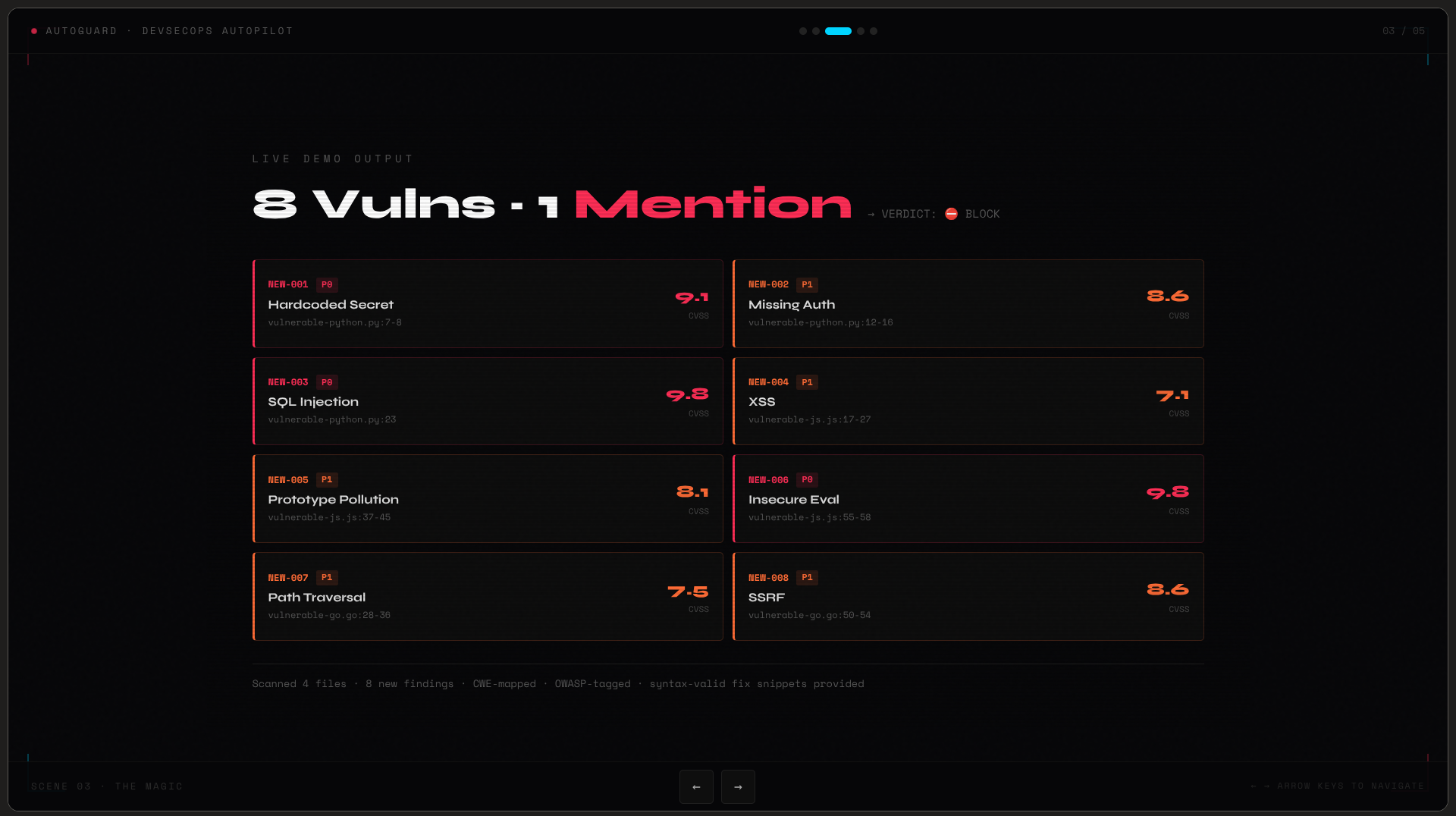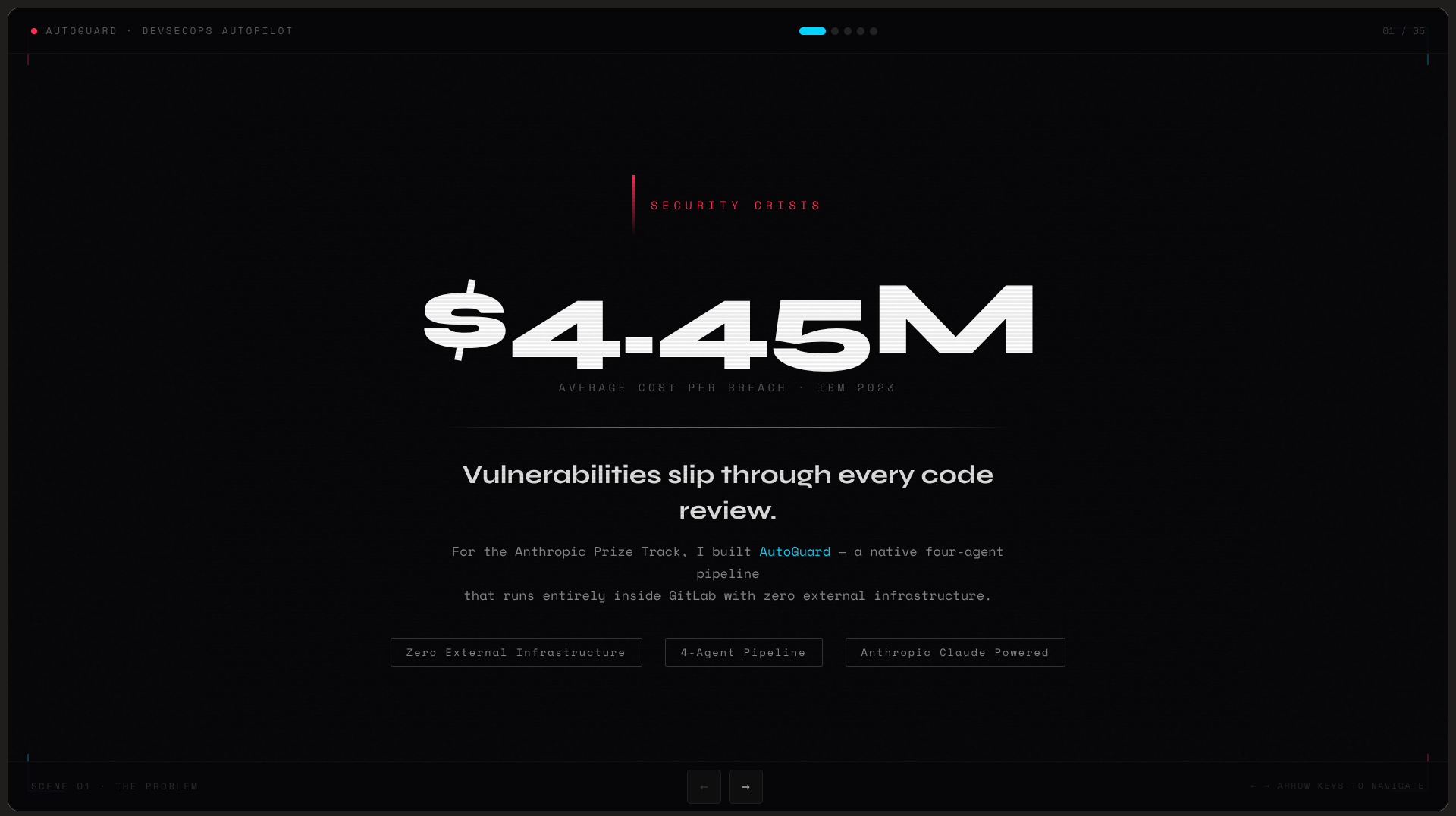 GitLab AutoGuard is an end-to-end autonomous multi-agent flow powered by Anthropic's Claude. By simply mentioning @autoguard on any Merge Request, a specialized four-agent pipeline springs into action.
