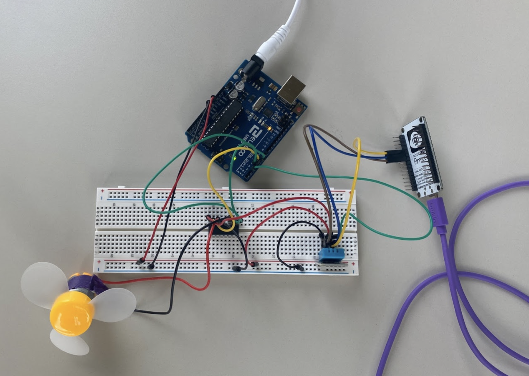 Our project as one sensor and one actuator. The sensor is the temperature and humidity sensor, and the actuator is a DC motor with a fan attachment. When the temperature rises above a comfortable room temperature (which we determined as the widely accepted 25 degrees Celsius), the fan will turn on. Once the temperature falls back below that level, the fan turns off.