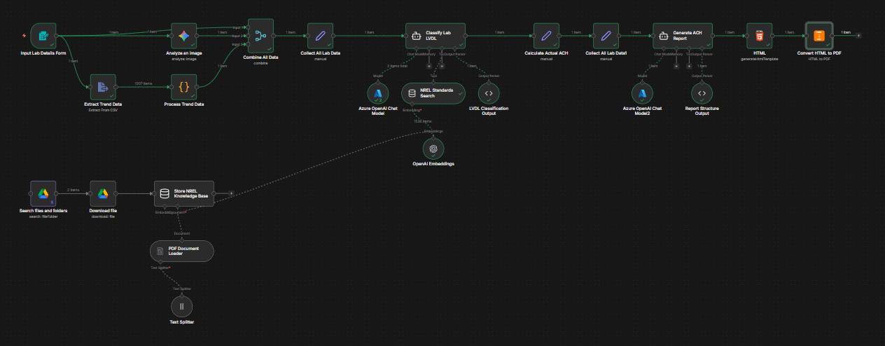 What it does The workflow collects chemical data, room dimensions, and trend data to run a deterministic risk assessment. Instead of guessing, it calculates the exact Air Changes per Hour (ACH) and volumetric flow (CFM) needed to stay safe while cutting unnecessary waste.