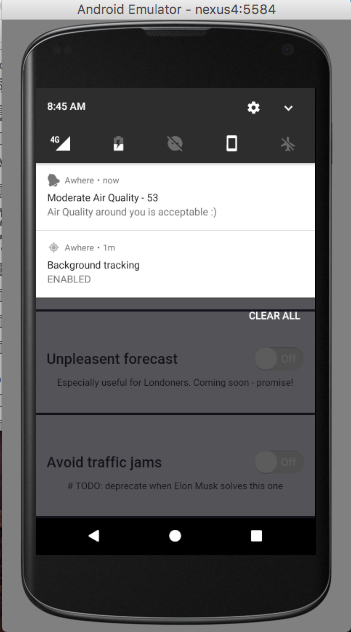 Awhere will make sure to notify you in scenarios that might be of interest. You might be suffering for a lung disease - awhere will notify you about air quality near you once it gets too bad. Is your skin sensitive ? - No problemo, awhere will tell you when you should stay indoors
