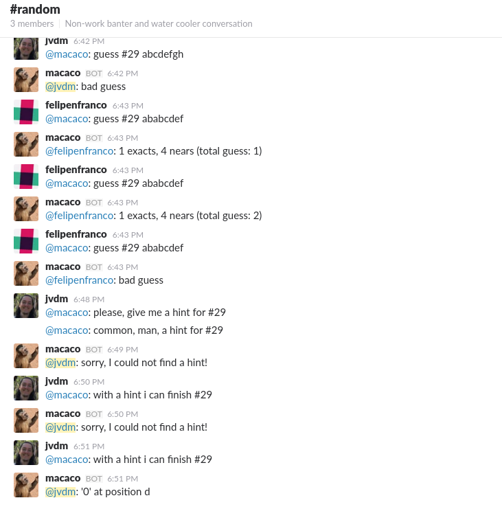 @jvdm: the game #1 has been created, there are 2 players (@jvdm, @felipenfranco), you all may send guesses by sending messages like 'guess #29 <your guess>'.