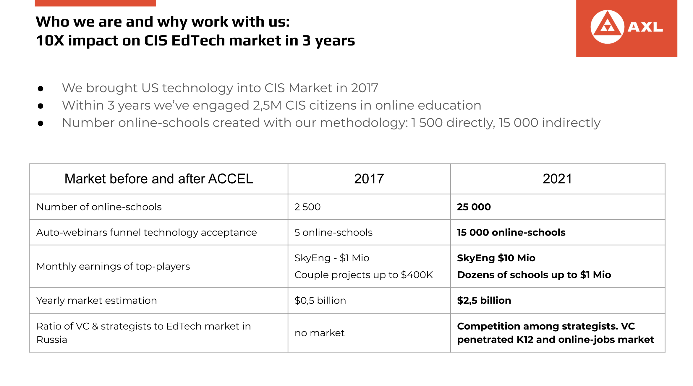 +We’ve improved lives of millions of people; +We changed and scaled 5-10X EdTech industry in CIS countries (form $0,5B to $2,5B); +We are moved our incubating program to SEA countries; +Our EdTech IT-platform technically is the best and powerful on the international market; +We have efficient and talented IT developers in our team.