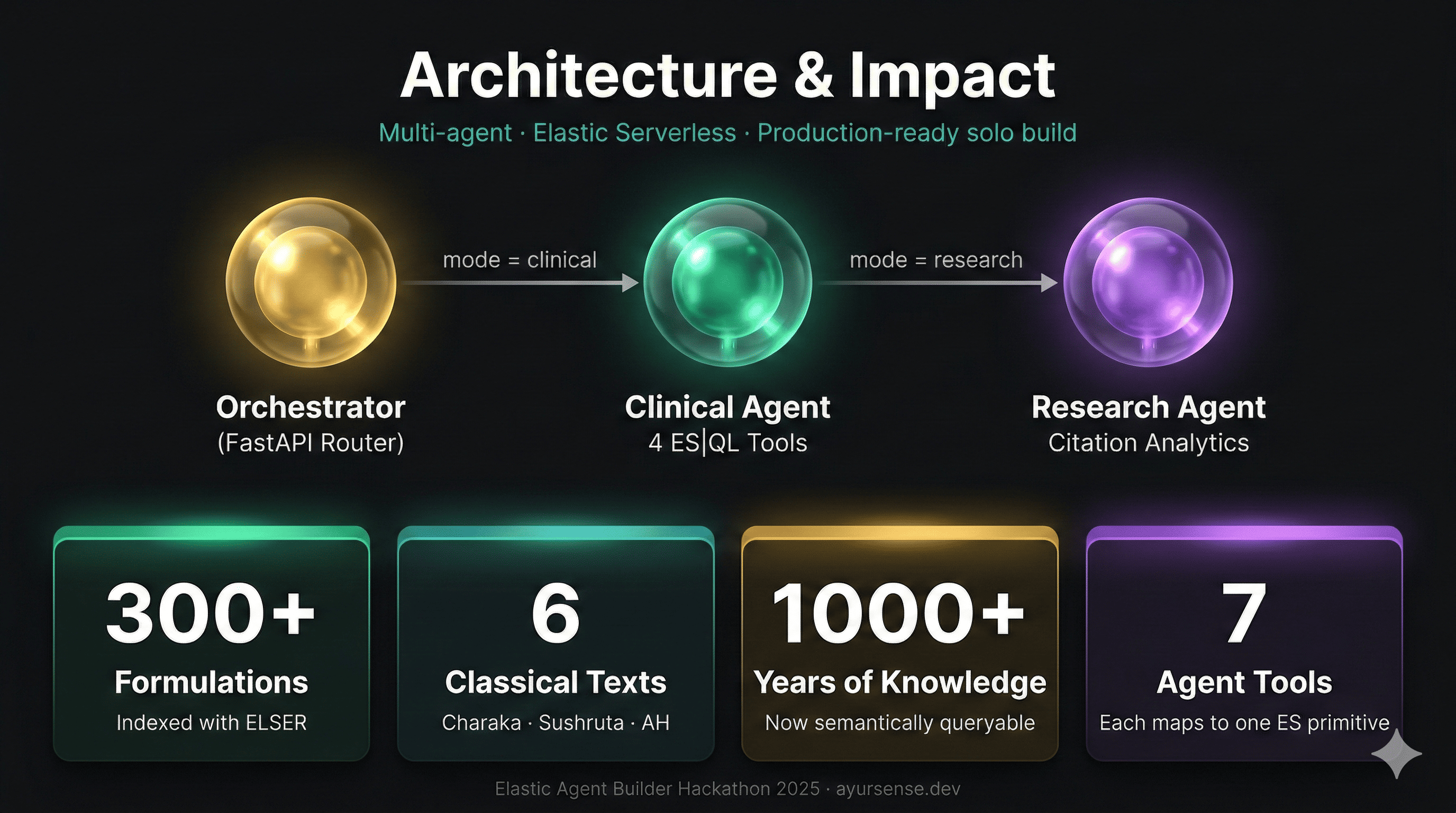 Running ELSER over Sanskrit medical texts and having it work — genuinely work, not approximately work — is the accomplishment I am most satisfied with. Sparse vector inference was not designed with Sanskrit in mind. Sanskrit Ayurvedic vocabulary is among the most domain-specific text any retrieval system could encounter: technical terminology with no modern usage, clinical concepts with no English equivalents, and a six-century span of textual variation across source texts. The fact that ELSER's semantic proximity model captures clinical relationships across this corpus — that querying "weak digestion" surfaces formulations treating Mandagni and Agnimandhya — is a demonstration that sparse vector inference handles narrow domain vocabulary better than any keyword-based approach could. Nobody has applied ELSER to this corpus before. That result matters beyond this hackathon.