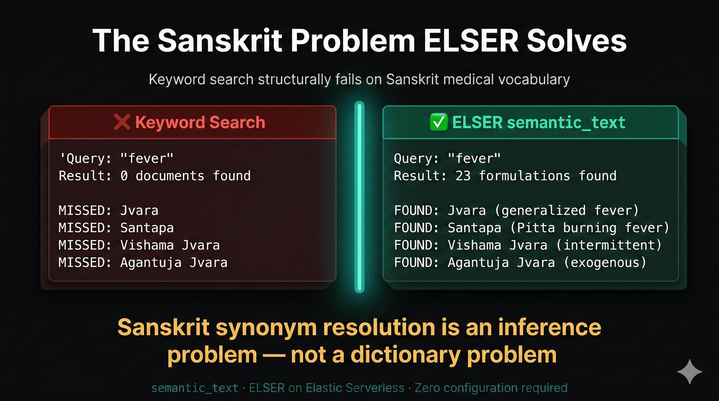 The deepest technical challenge was Sanskrit's vocabulary topology. A keyword search for "fever" across 300 formulations would return nothing — the texts use Jvara, Santapa, and Vishama Jvara for clinically distinct fever types that share no English characters. The naive solution is a translation dictionary. The real solution is understanding that Sanskrit medical vocabulary is not a finite enumerable set — it is a living clinical language where the same English concept maps to multiple Sanskrit terms with different clinical weights depending on the school of thought, the century of the text, and the patient constitution being described. ELSER handles the open vocabulary problem because sparse vector inference captures semantic proximity across domains even when direct lexical overlap is zero. The two-layer architecture — synonym index for deterministic precision on known clinical terms, ELSER for open vocabulary semantic recall — took several iterations to calibrate correctly. Relying only on the synonym index produced brittle results when English input varied from the indexed terms. Relying only on ELSER drifted on high-stakes clinical Sanskrit terms with low English corpus representation. Both layers together produce reliable retrieval.