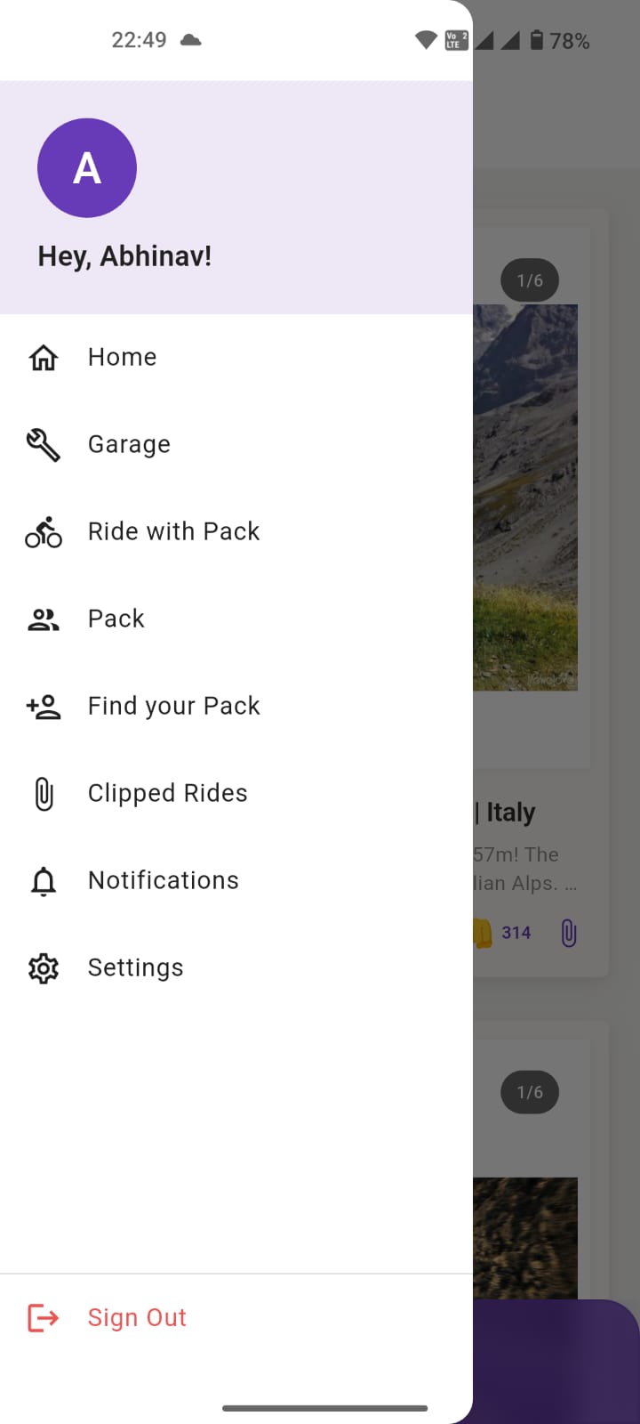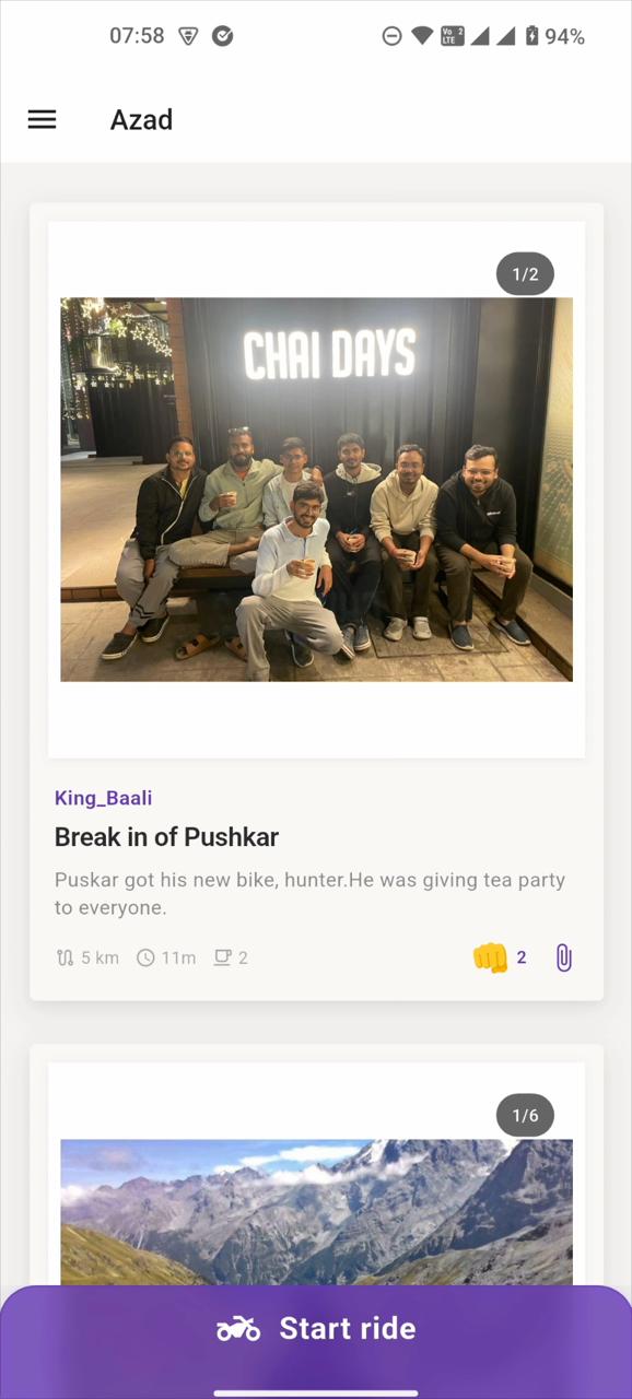 The feed page.You can see there is option to fist bump.Bikers bumps fist :) .It's kind of like button.Also clip button to bookmark trip