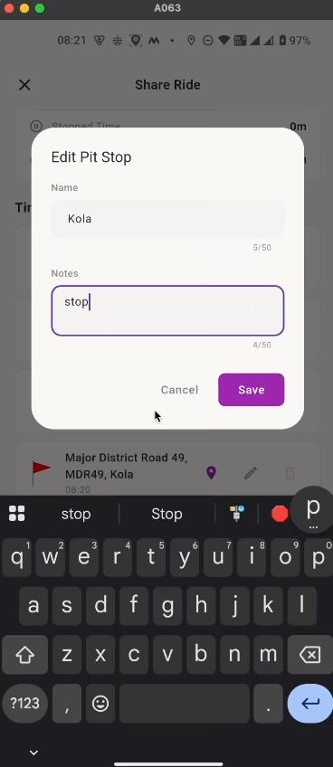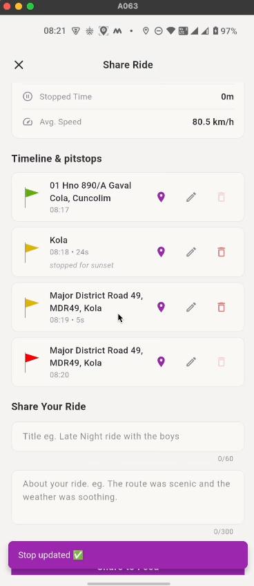 automated geo-decoded data of the user he has marked stop during ride.