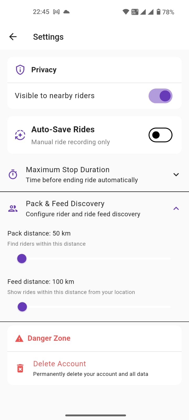 settings page.User has option to enable auto-save rides.Also option to make his shared rides available to people around.