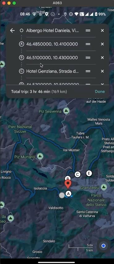 Recorded route of the user with stop description.