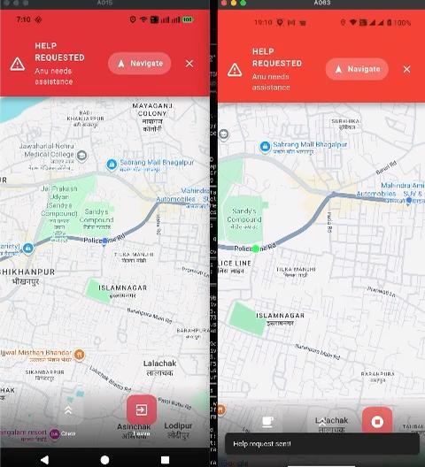 SOS alert triggered by one of the crew.Phone vibrates and navigation button is also visible for group riders to reach rider in distress.
