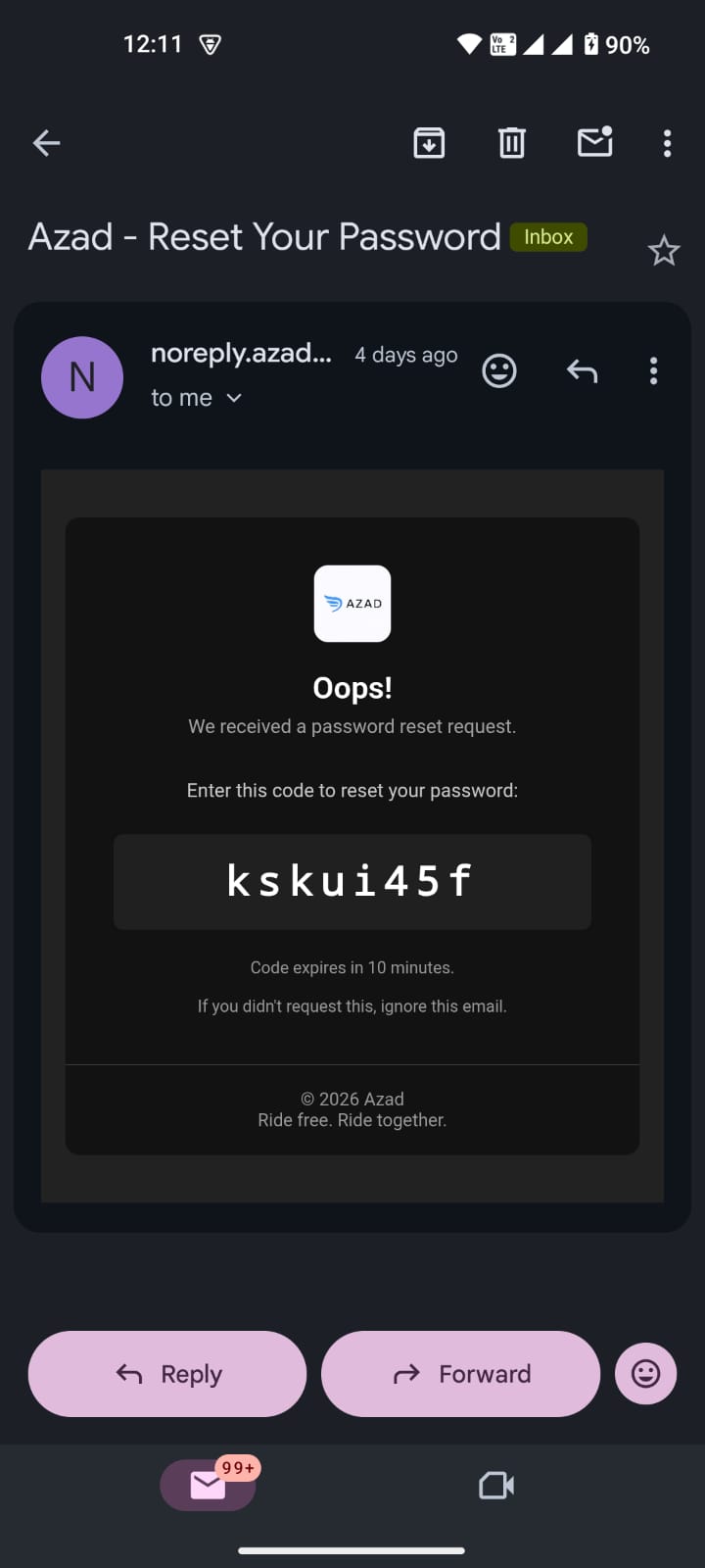 password reset email by Azad app
