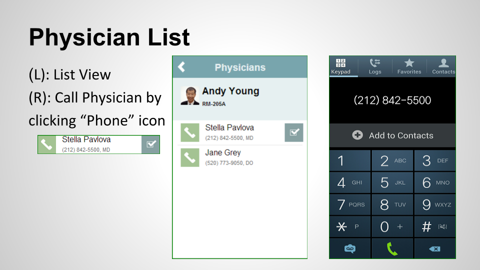 - Nurses can call Patients, Physicians and Family members directly from the App with their mobile phones.