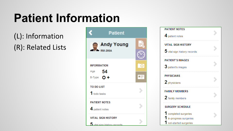 - Patient information - Patient Details, Address map, To Do list, Patient Notes, Vital Sign History, Patient's Images, Physician Contact info, Family Contact info and Surgery Schedule.