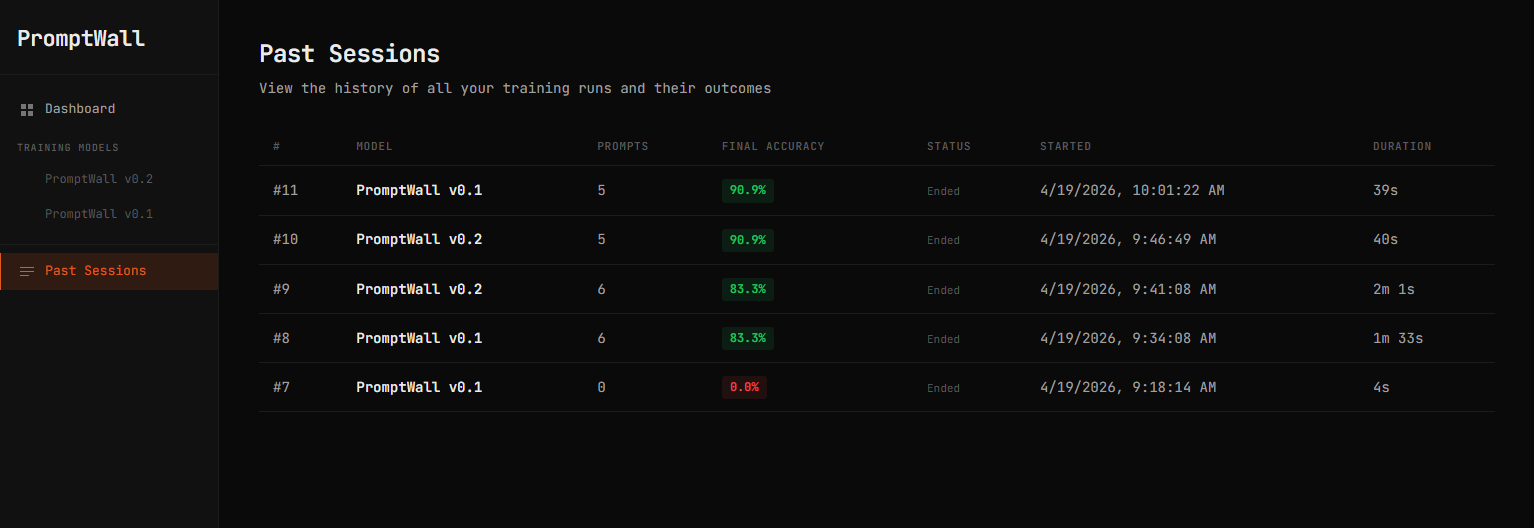 We built PromptWall using Node.js and Express for the backend, PostgreSQL for storing prompts, responses, and learning signals, and the Groq API for fast LLM inference. The system is powered by a multi-agent pipeline: a ground-truth model produces the correct response, a training model attempts the same prompt, and an orchestrator evaluates the difference. When failures occur, specialized agents generate insights and update the model’s evolving rule set, which is injected into future prompts to improve performance.