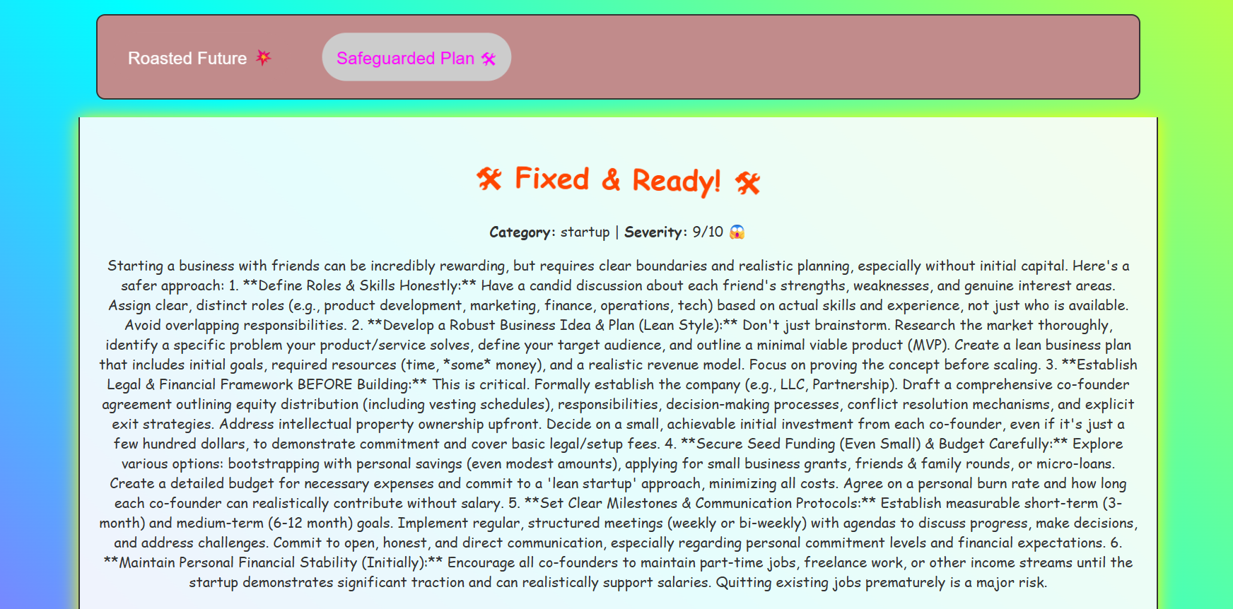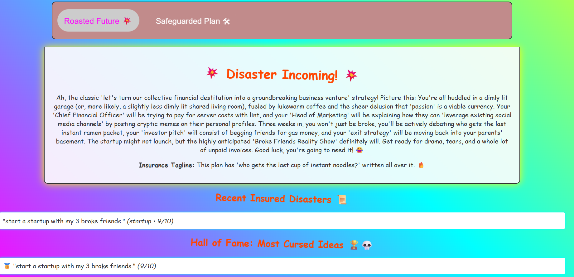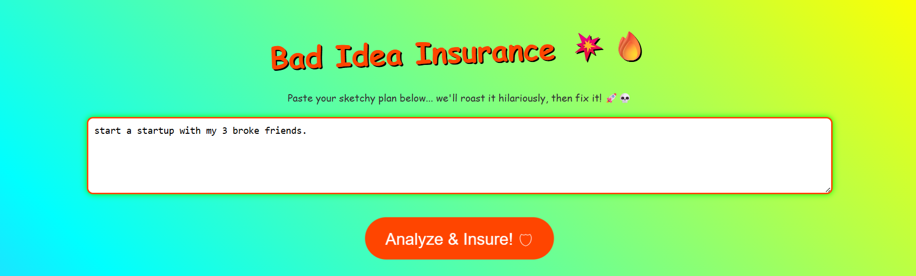 We've all had that moment where a friend pitches an idea and you just know it's going to be a disaster – but you don't want to crush their dreams. We wanted to create a tool that could humorously highlight the risks in questionable plans while actually providing constructive, actionable advice.