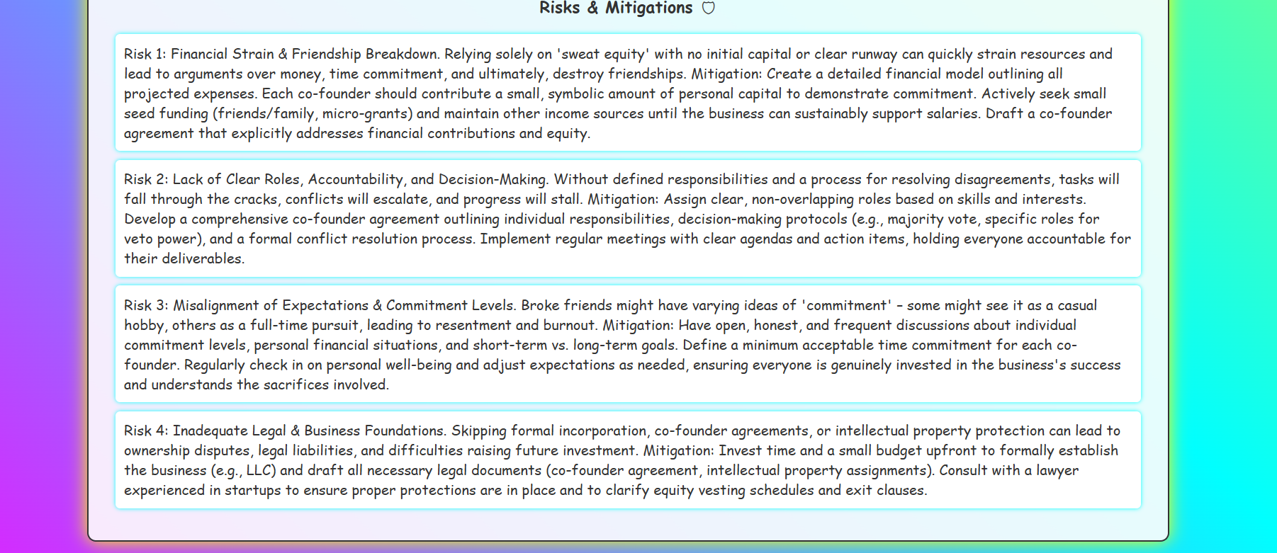 - Risk Analysis: Top 3 risks with concrete mitigation strategies