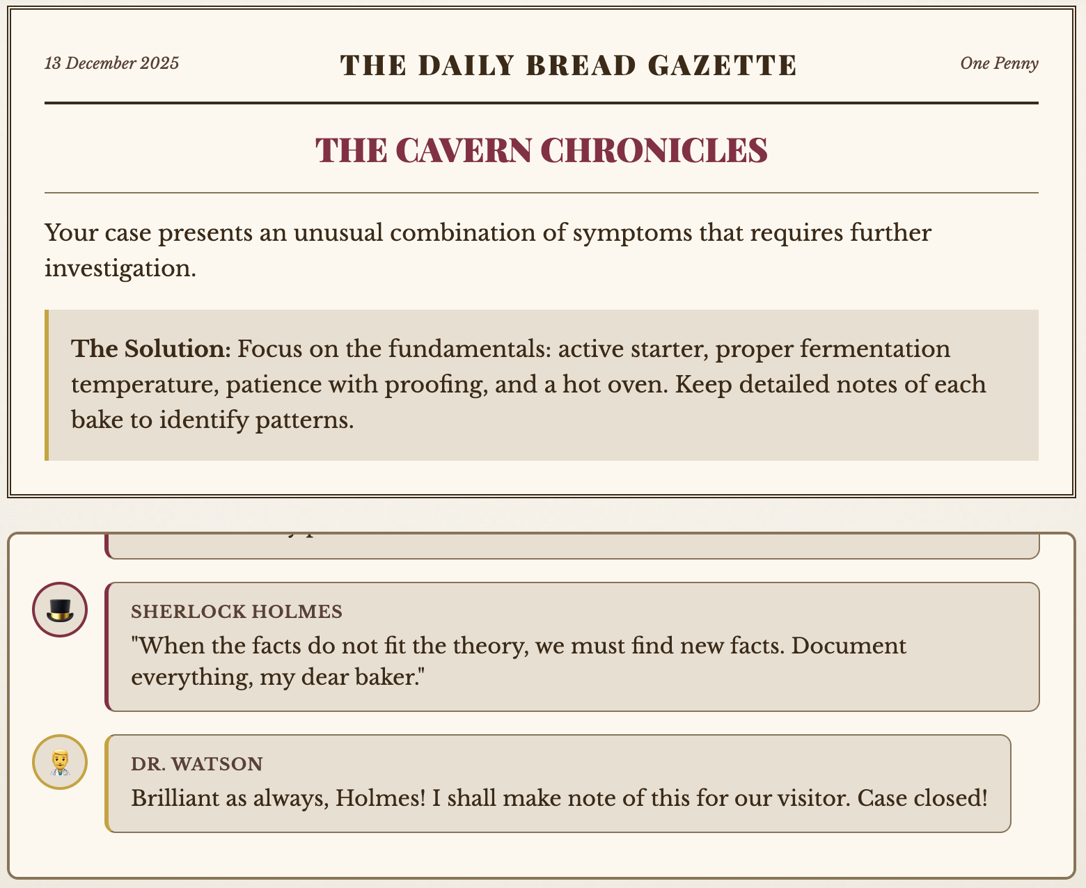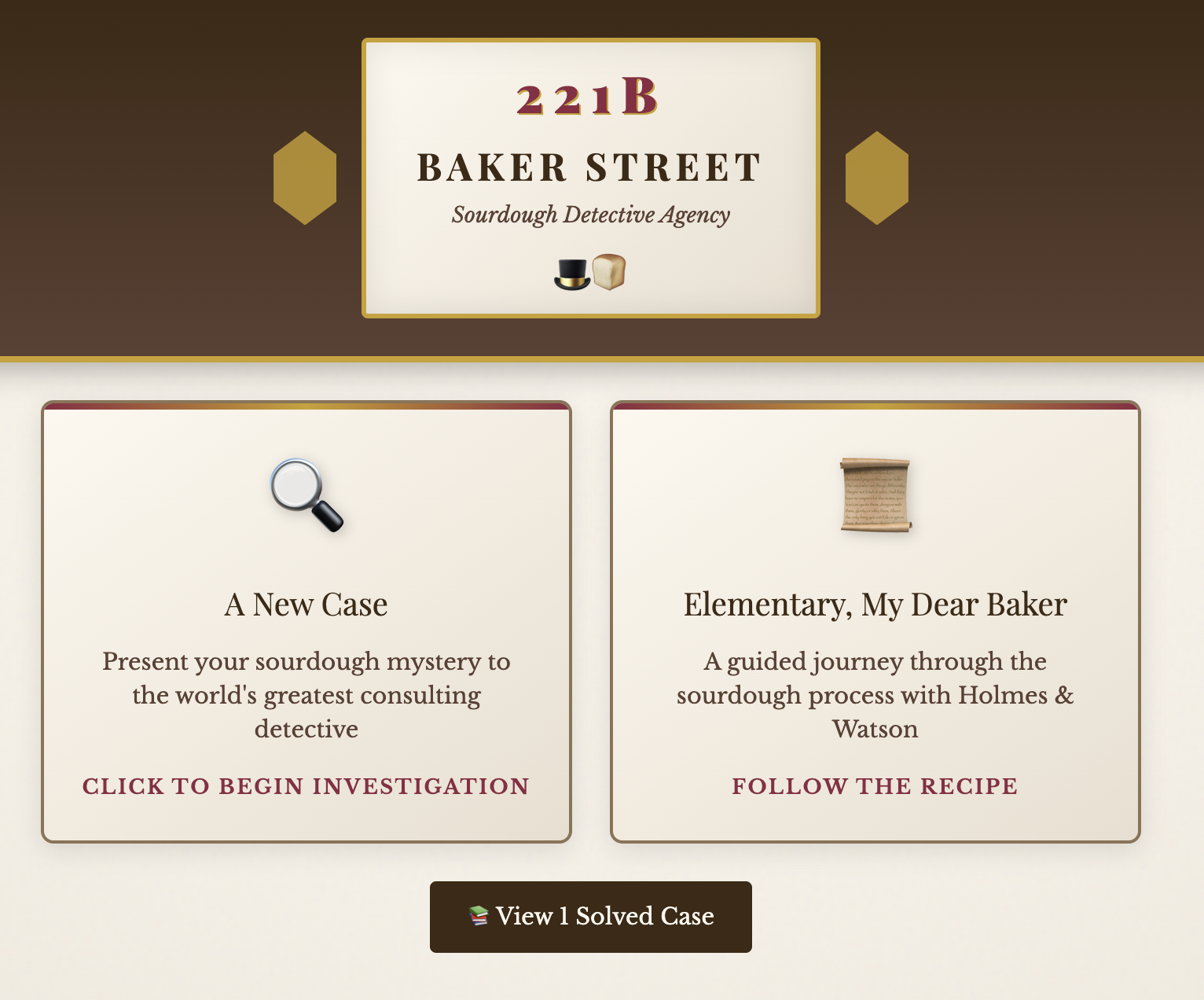 Present your sourdough mystery to the world's greatest consulting detective for a guided journey through the sourdough process. Built With berry.app Try it out bakerstreet.berrry.app