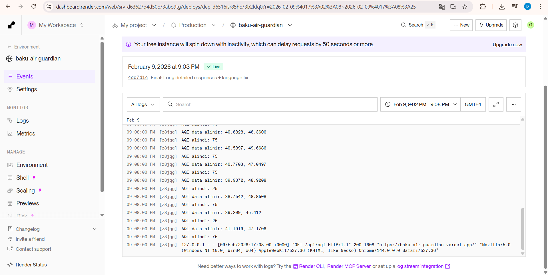 Backend API running on Render - Real-time AQI data collection and Gemini AI integration