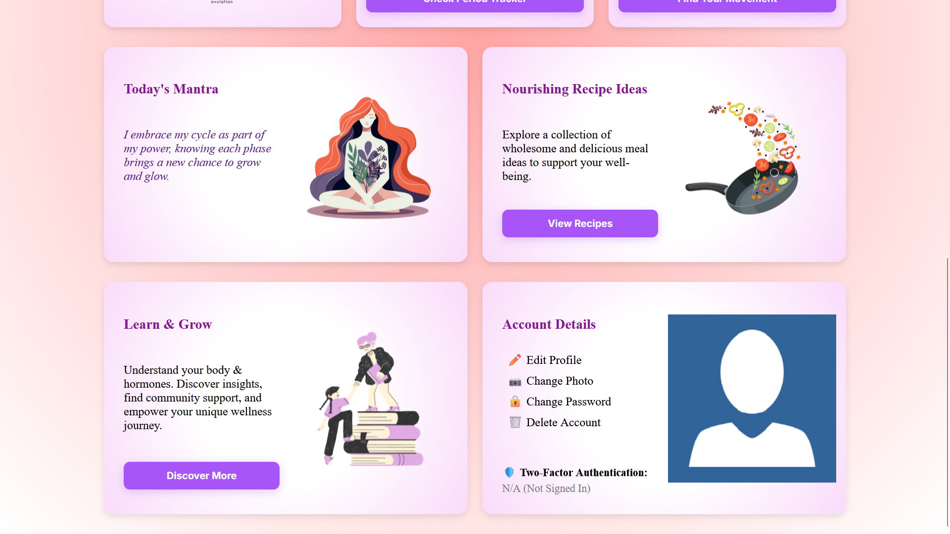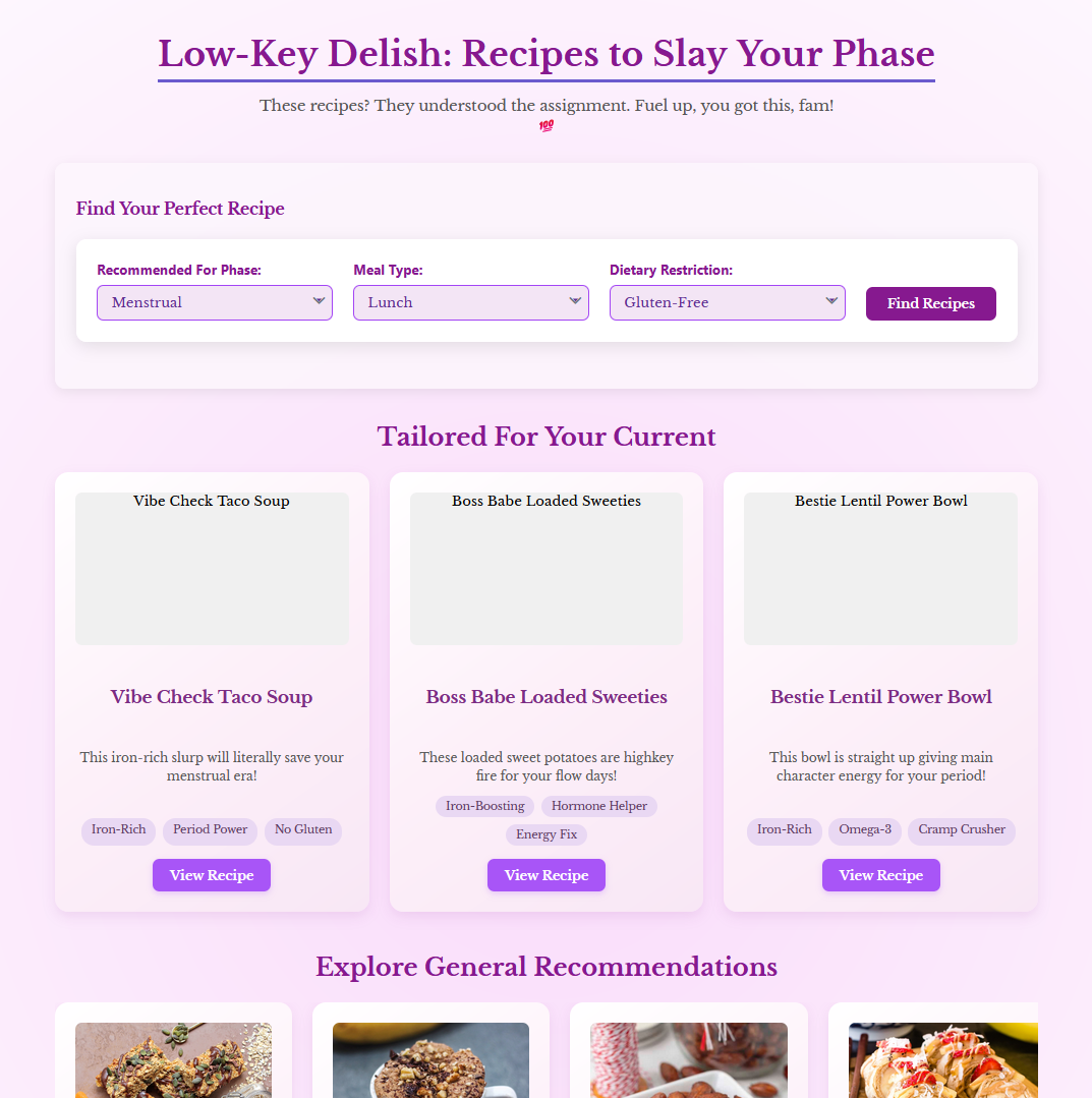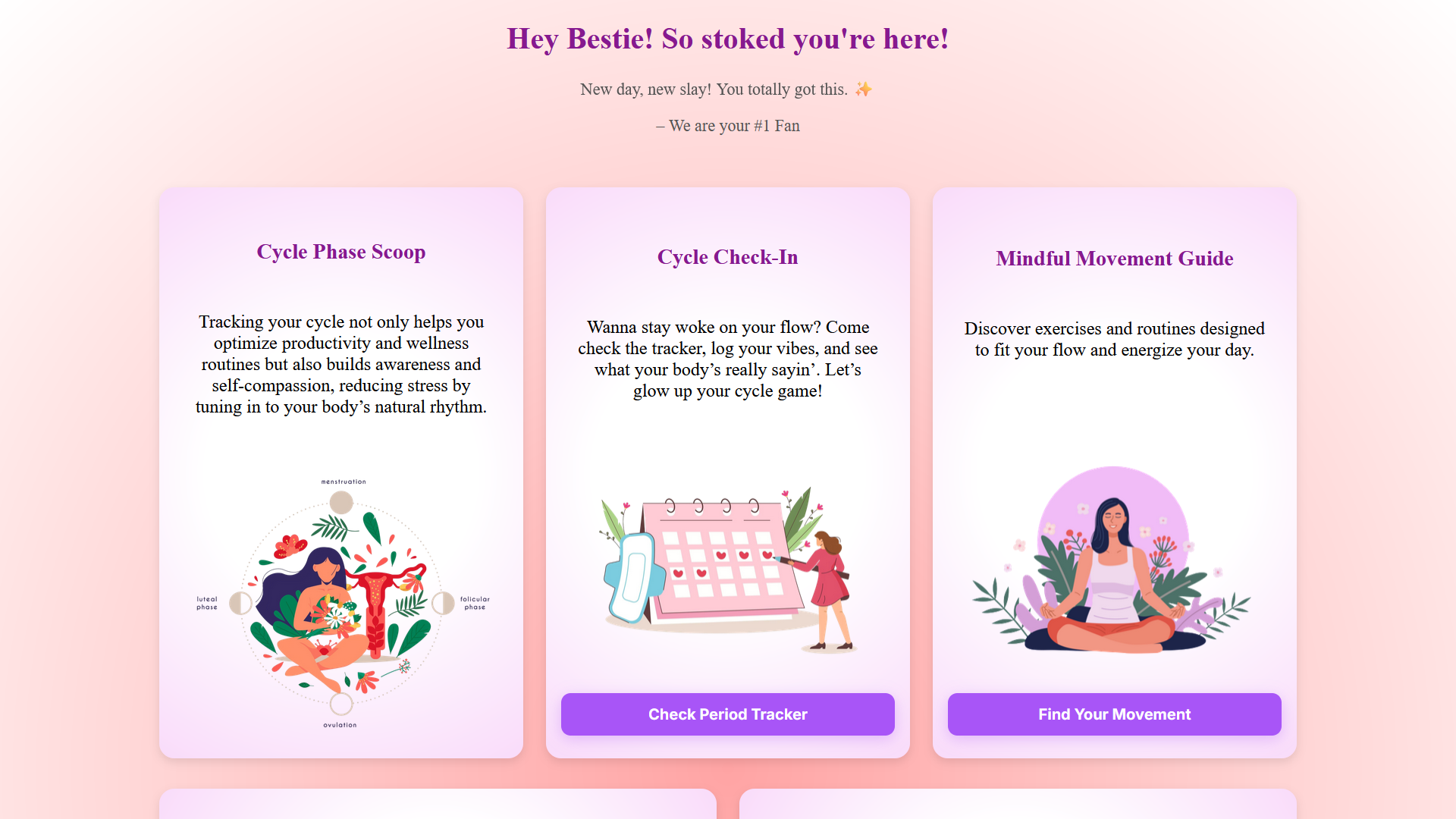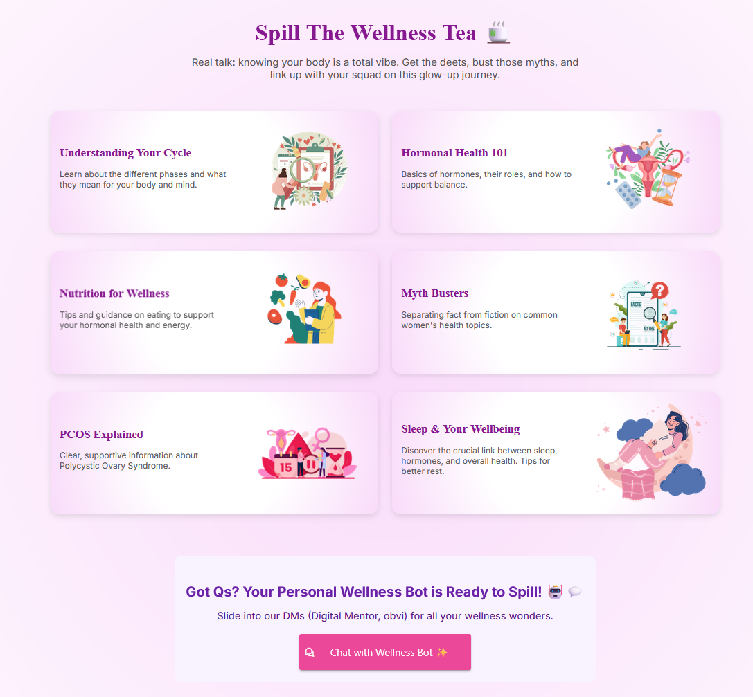 We were inspired by the gap in menstrual wellness resources and the persistent stigma around periods. Many apps focus only on cycle tracking, but few offer a comprehensive, personalized approach. We wanted to create something that combines evidence-based insights, supportive nutrition and exercise suggestions, and positive messaging to help women feel empowered throughout their cycle.