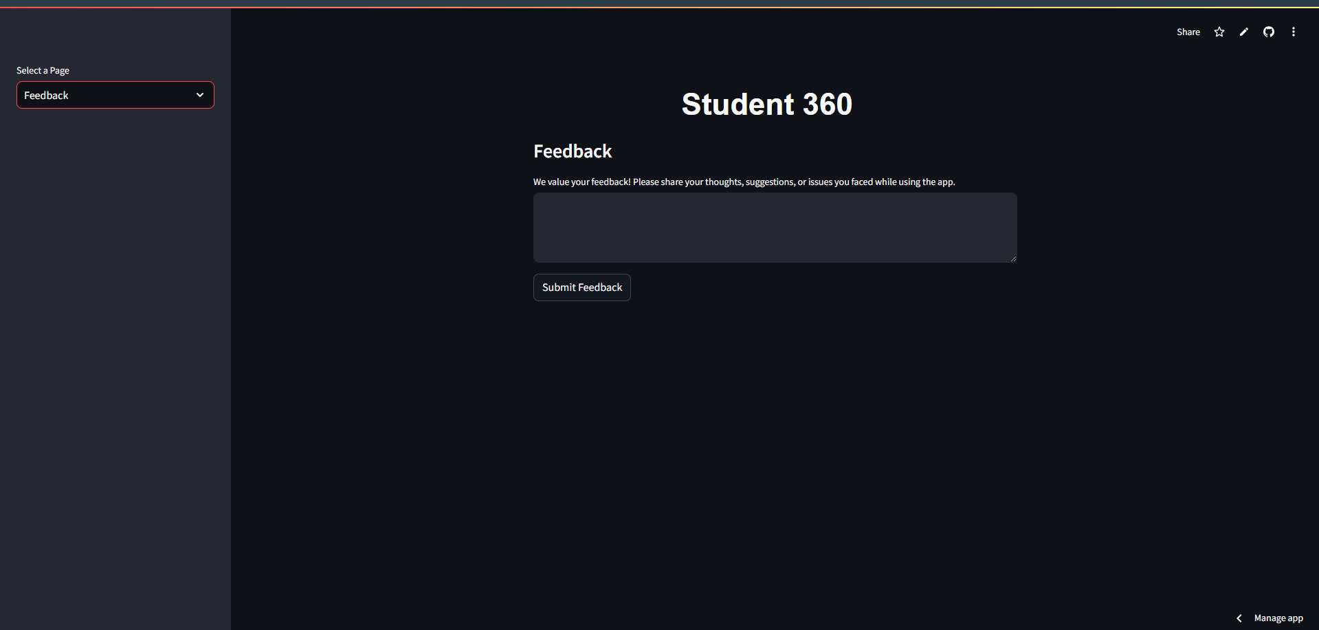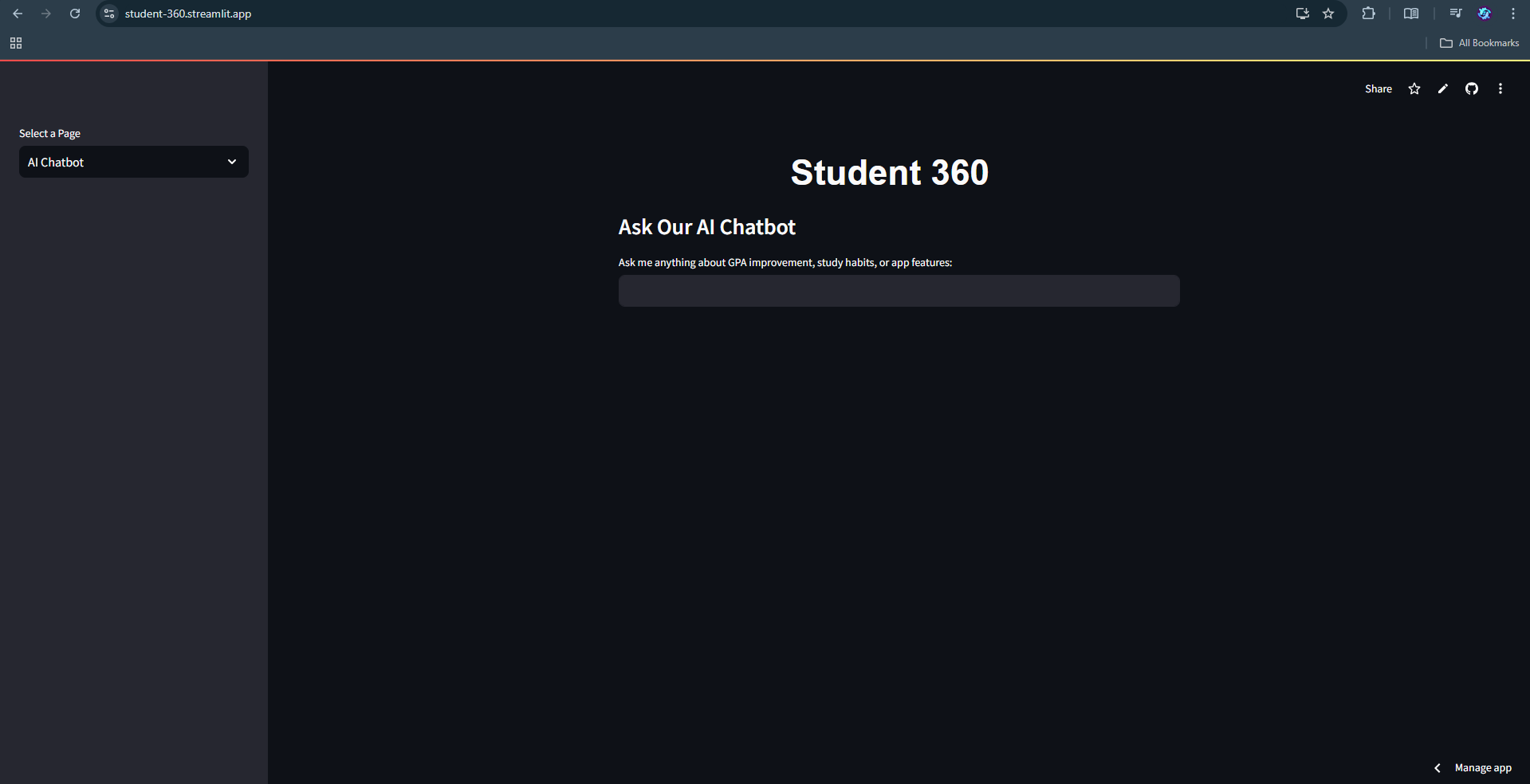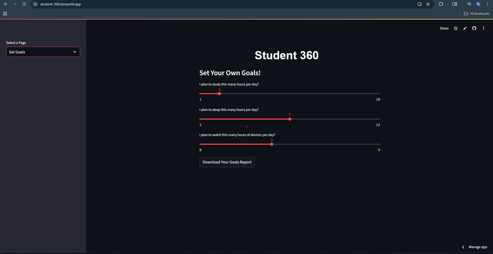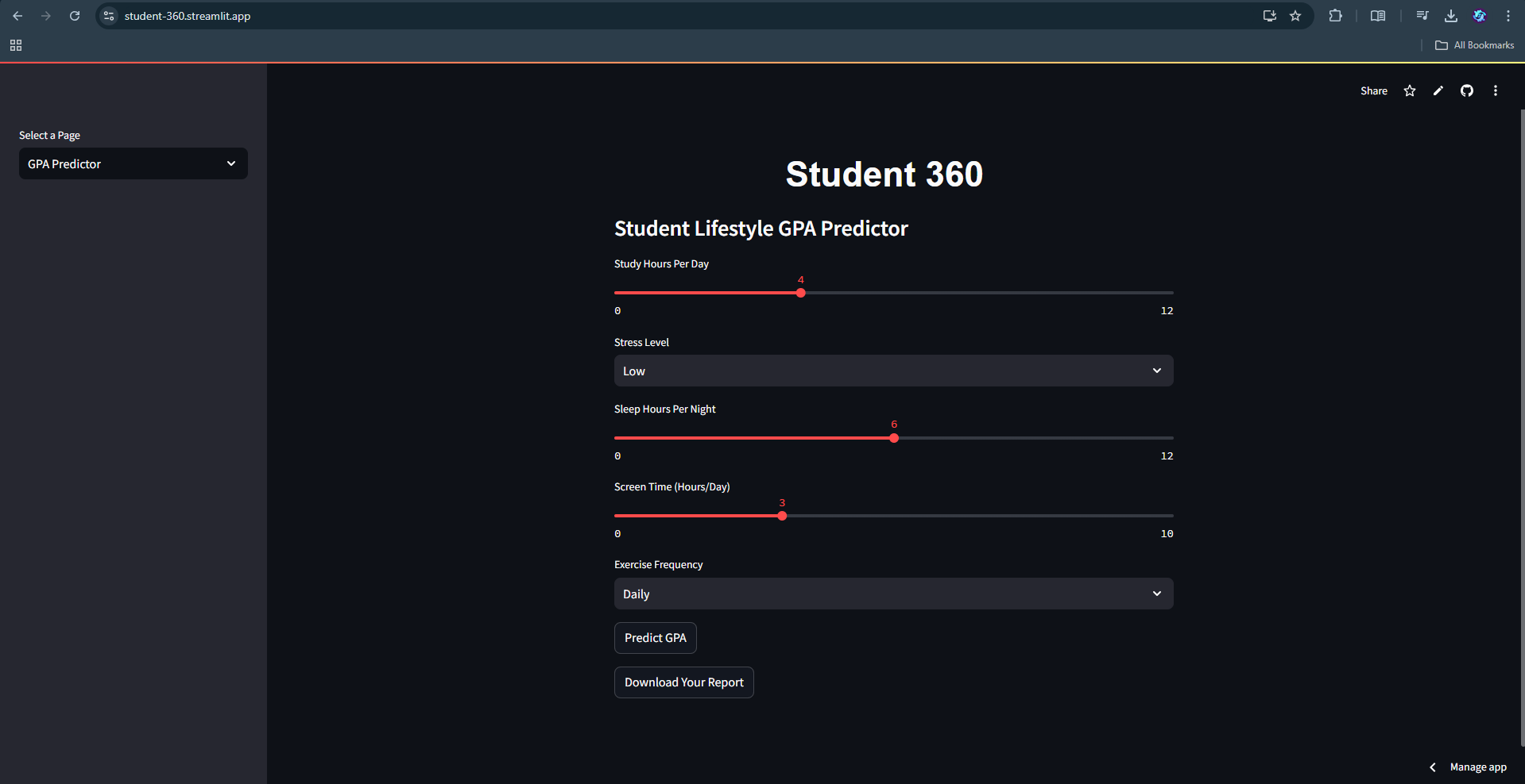 Student 360 is a tool that combines machine learning with lifestyle management to help students understand how their habits affect their academic success. With personalized recommendations, real-time GPA predictions, and goal-setting features, the app empowers students to make data-driven decisions that can lead to better academic outcomes. This project not only helped me improve my technical skills but also gave me the opportunity to build something that can potentially make a positive impact on students' lives.