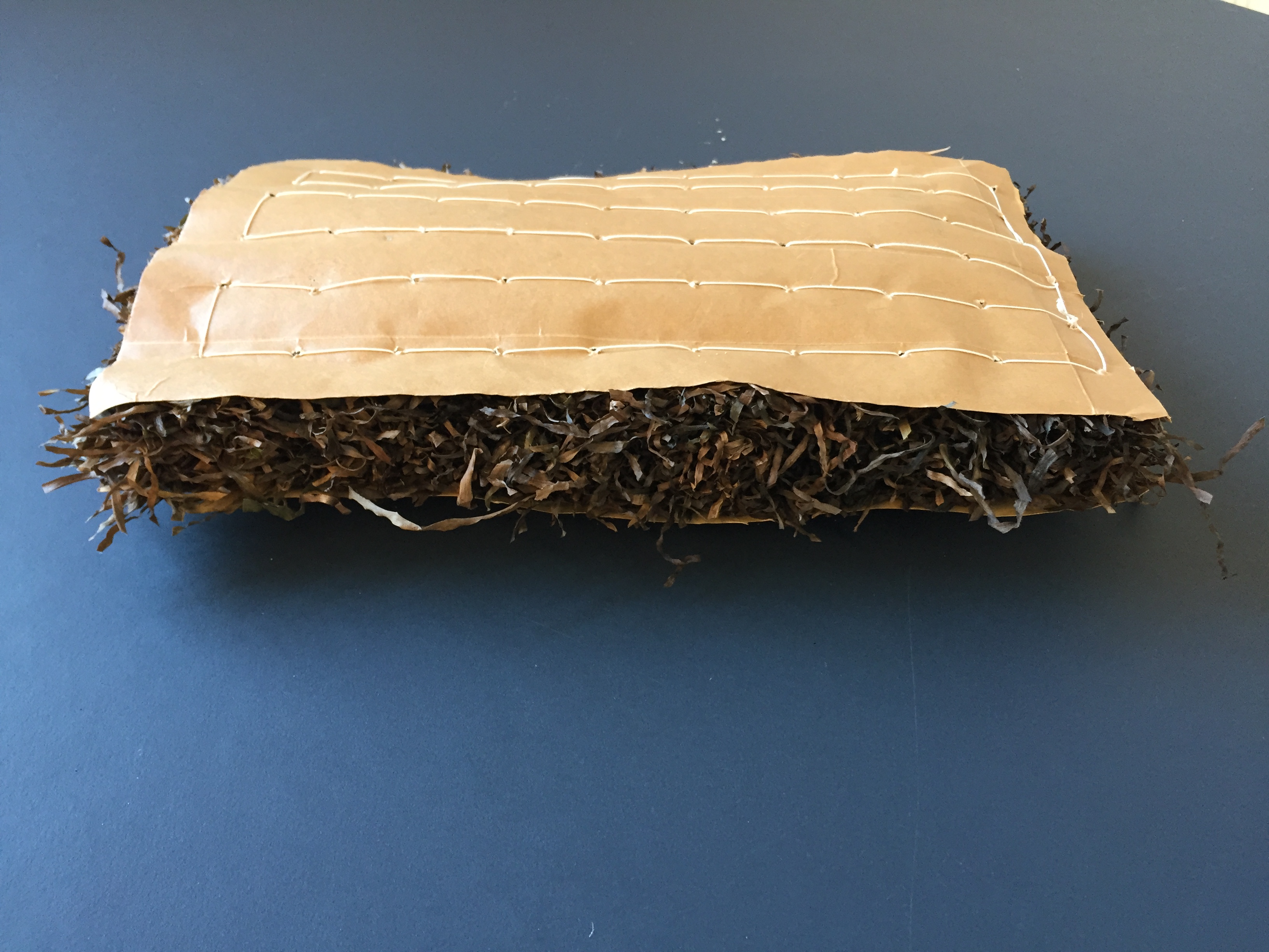 [Konzept] Durch die Aufspaltung des Seegrasblattes lässt sich die darin enthaltene Zellulose nutzbar machen. Während Bäume für die Papierherstellung zwischen 40-45 % Zellulose enthalten, ist die Menge bei heimischem Seegras mit 57 % etwa 1,5 Mal so hoch. Diese Zellulose ließe sich zu Garn spinnen und anschließend weiter zu Stoffen verarbeiten. Die Zellulose wäre auch für die Erstellung eines Verbundwerkstoffes zum Dämmmaterial nutzbar (Garn, Papiersäcke)