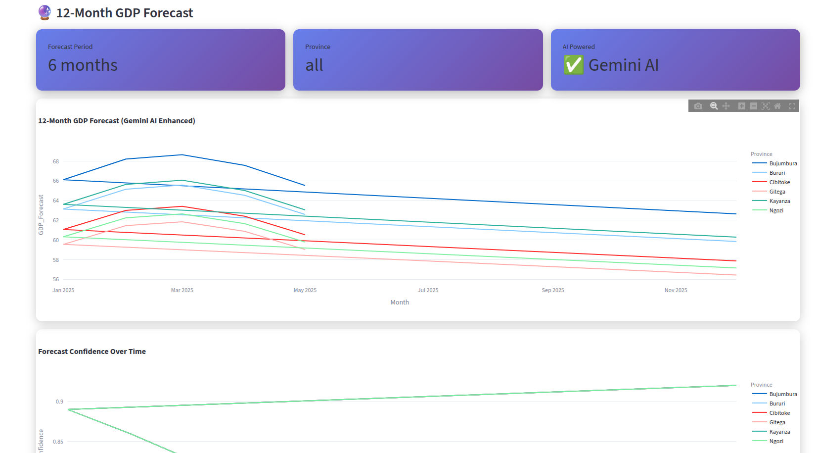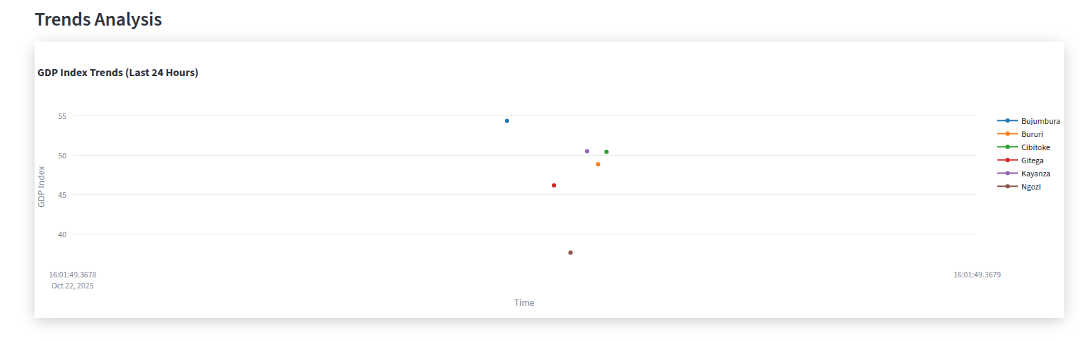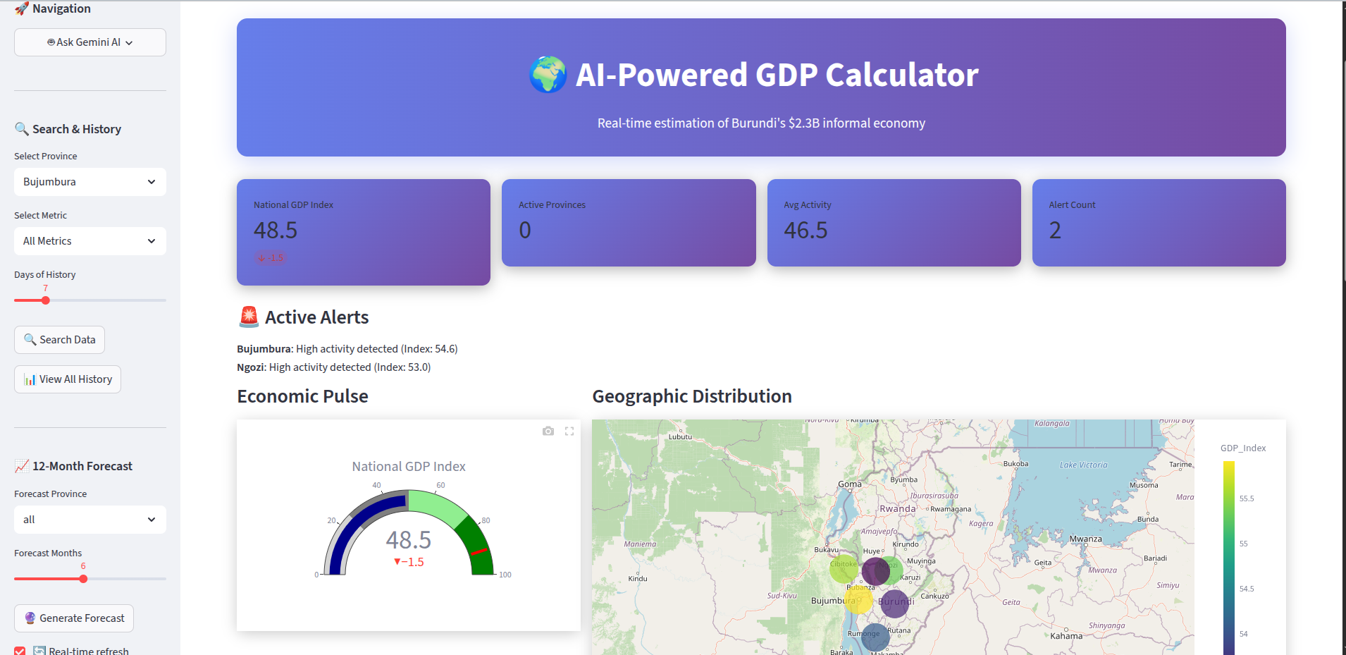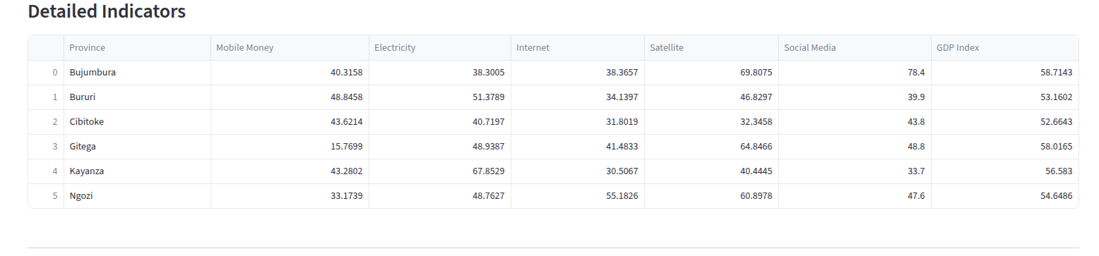 - Calculating a Real-Time GDP Index: Using a data fusion engine and a machine learning model, the platform calculates a real-time "Informal GDP Index" for each province in Burundi, as well as a national average.