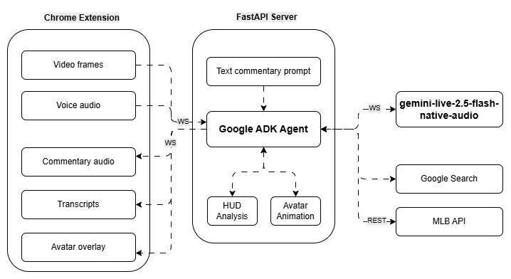 gemini-live-2.5-flash-native-audiovia Vertex AI for native audio input/output. The agent calls a compositeanalyze_gametool that runs HUD OCR analysis and MLB player stat lookups in parallel viaasyncio.gather(), plus Google Search for supplementary context.FastAPI Server — Manages a bidirectional WebSocket connection with three concurrent async tasks: an upstream task queuing video frames and audio to the agent, a downstream task streaming commentary audio and transcripts back to the browser, and a commentary task that periodically prompts the agent to keep talking.