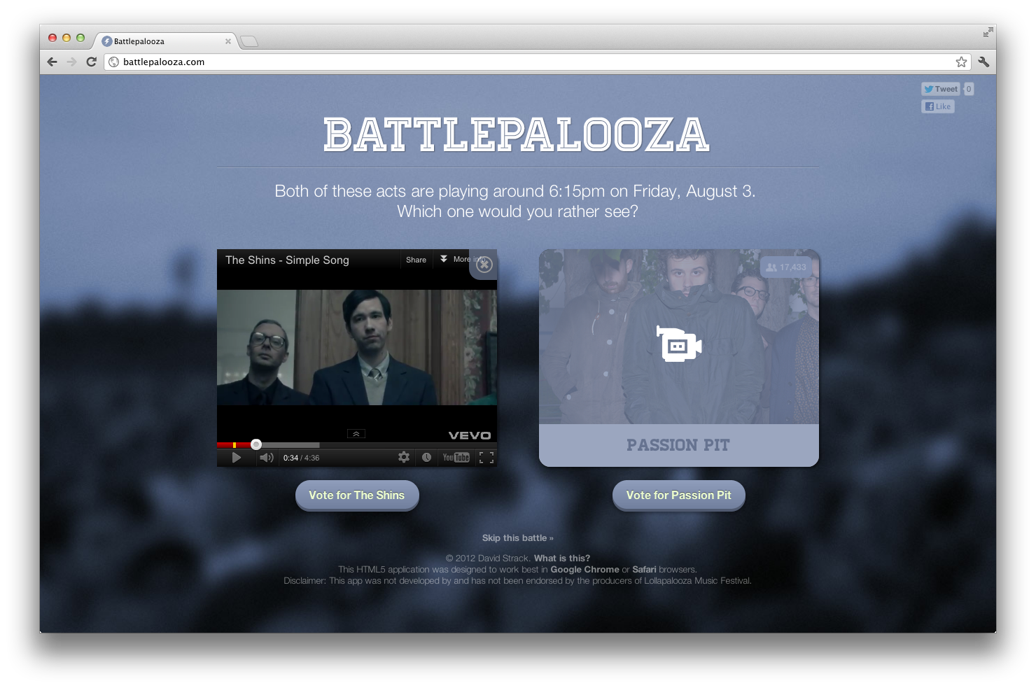 Battlepalooza is a game where players can vote on one of two conflicting shows in a series of random battles. Users can also play a YouTube video of each band right on the battlefield, creating an easy and fun way to discover new acts to see at Lollapalooza.