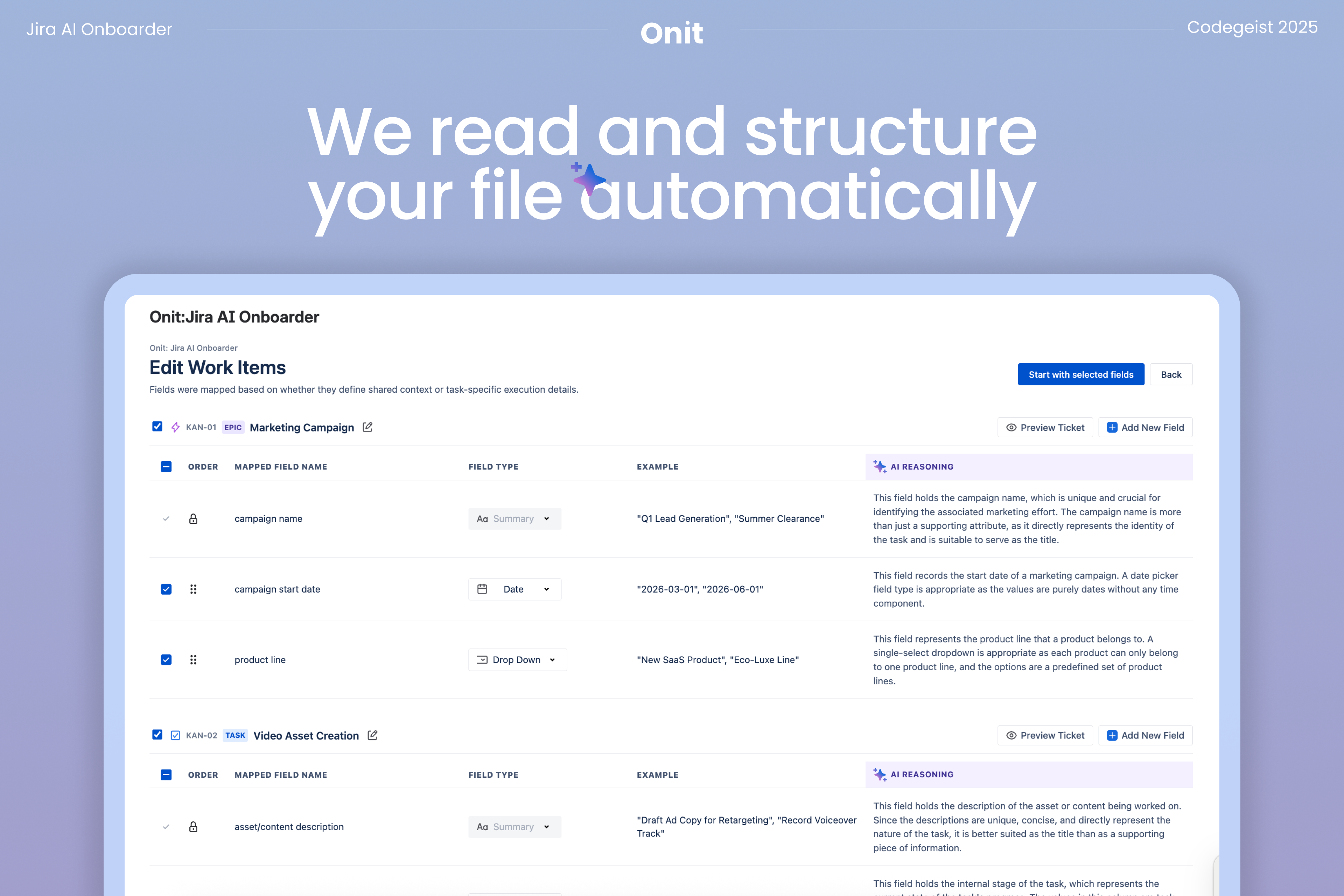 After uploading, Onit generates a first draft of your Jira structure. This includes suggested issue types, epic and task hierarchy, and recommended field mappings. Instead of applying a generic template, the draft is derived from your data so the resulting workspace matches how your team actually plans and tracks work.