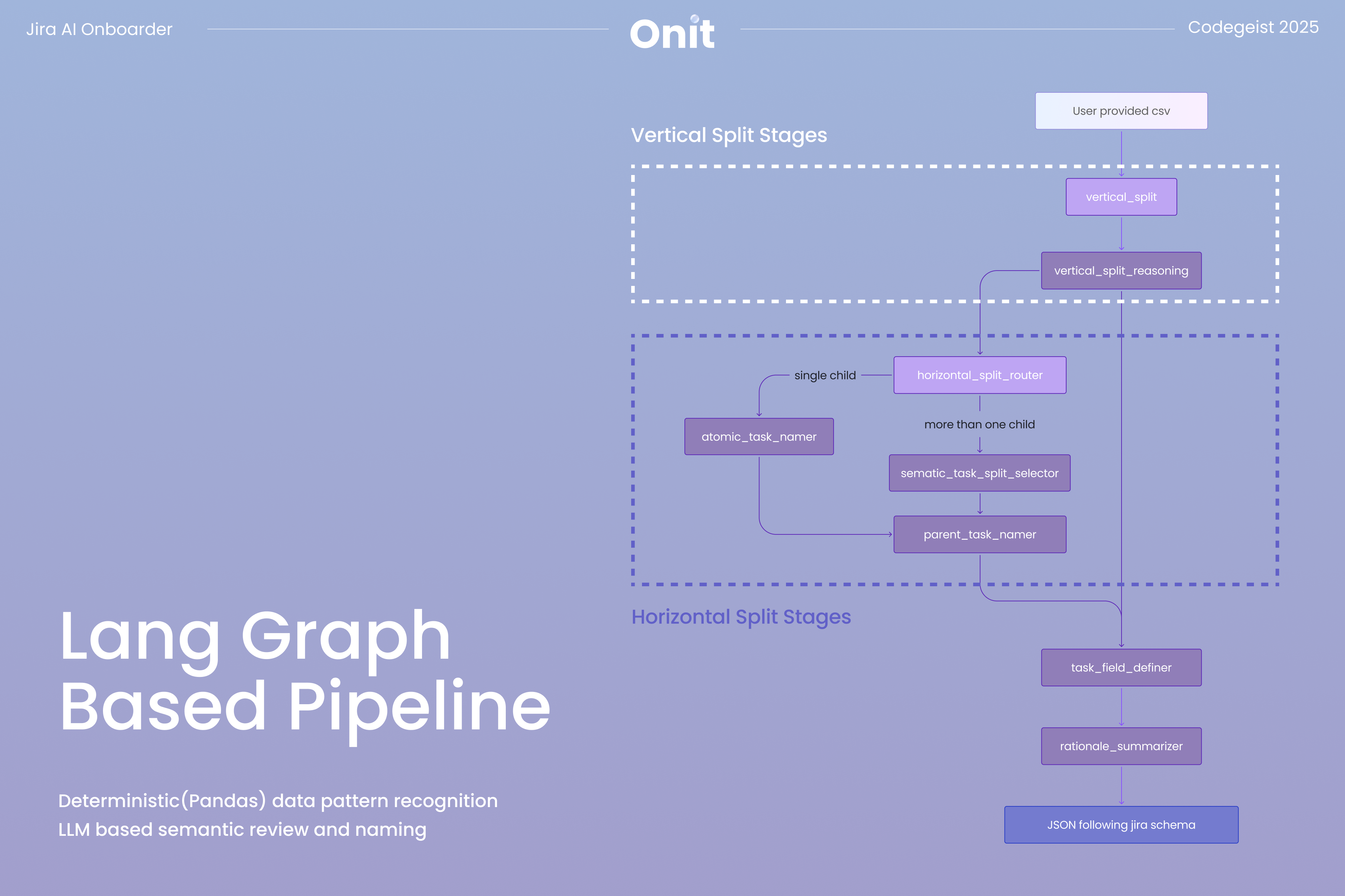 The first stage, the "Vertical Split", focuses on identifying parent-level work. Using deterministic Pandas logic, the system isolates columns with high redundancy that are likely to represent parent entities in the 'vertical_split' node. An LLM validation step then checks whether these groupings reflect meaningful business hierarchies rather than coincidental repetition in the 'vertical_split_reasoning' node. This ensures that proposed parent tasks, such as Epics, are grounded in real project context.