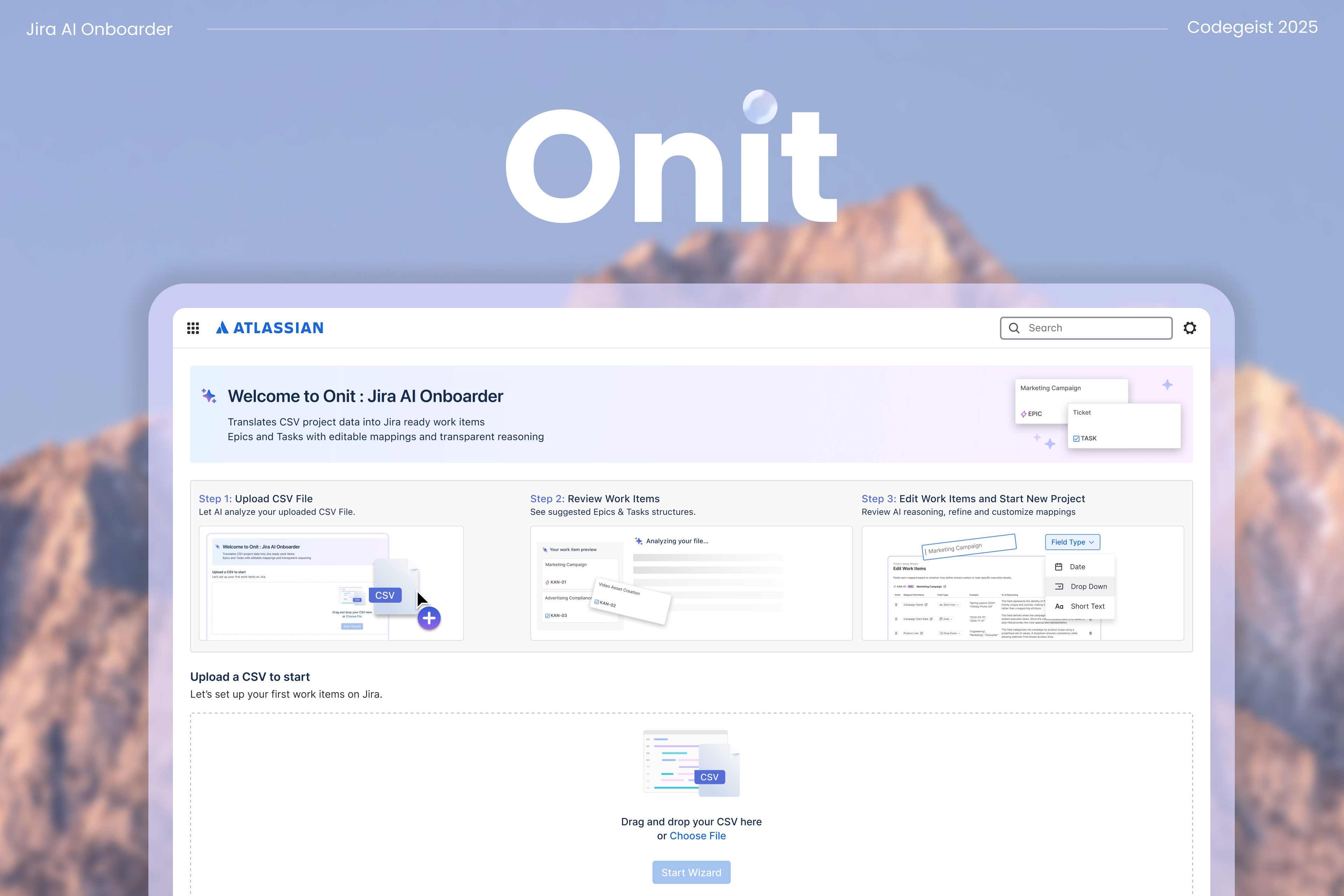 Start by uploading the spreadsheet your team already uses. Onit treats your CSV as real project data, not just rows and columns. It looks for signals like naming patterns, dependencies, and field context to understand what your work represents and how it should be structured in Jira.