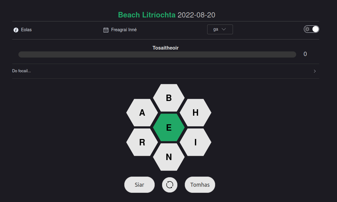 Leagan Gaeilge ar an gcluiche Spelling Bee ón New York Times.