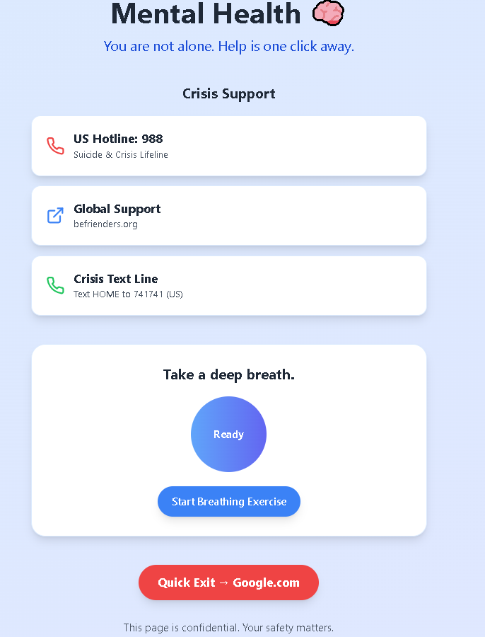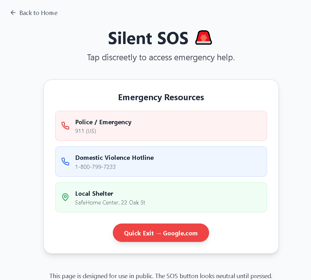 All interactions are designed to be fast, clear, and actionable, making it a reliable lifeline for anyone in need.