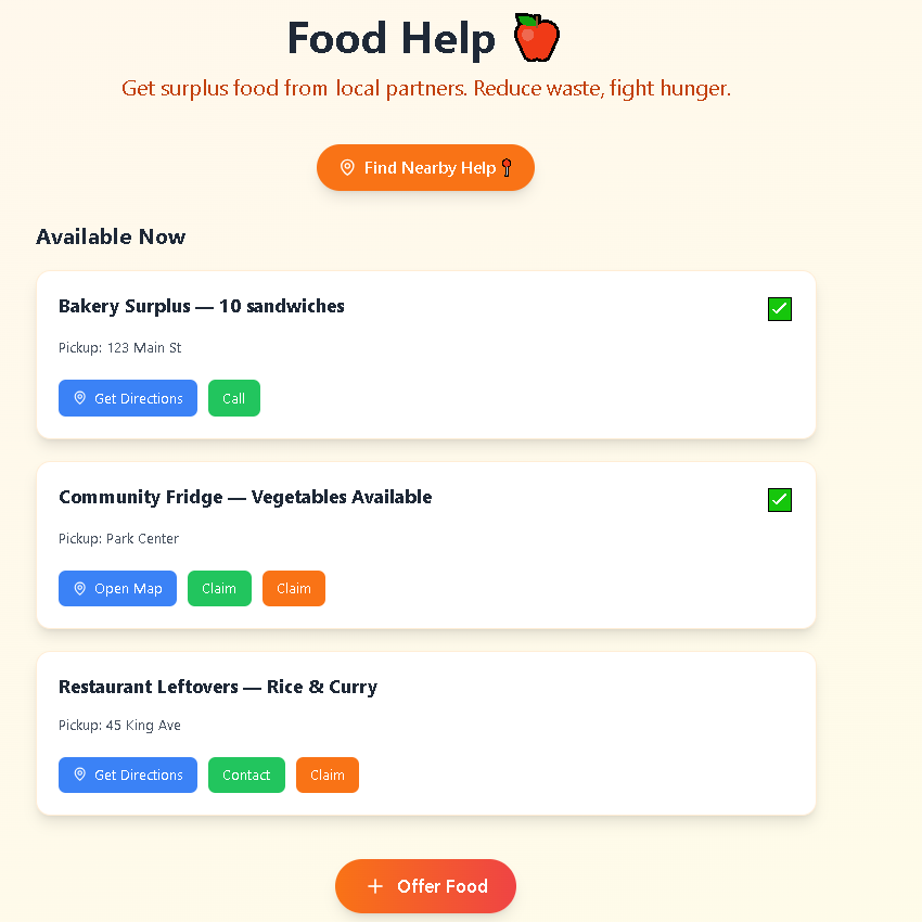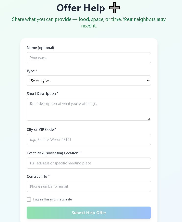 - Used forms and listing cards to simulate real-time help availability, with city/ZIP for location awareness.